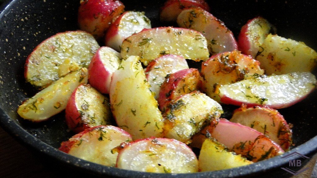 Новое, оригинальное и вкусное блюдо – жаренная редиска. Сытное и лёгкое, вкусное и непривычное… Вот что можно сказать об этом гарнире, попробовав его в первый раз. Ингредиенты: 200-250 грамм свежей редиски, 1 столовая ложка кукурузного или картофельного крахмала, 2-3 зубчика чеснока, пол чайной ложки соли, перец – по вкусу, 1 чайная ложка свежего укропа или прованских/итальянских трав, растительное масло – для жарки. Процесс приготовления: Свежую редиску моем и вытираем насухо. Если редиска небольшая, то разрезаем на 4 дольки, если крупная – долек стоит сделать больше. Отправляем дольки редиски в пищевой пакет и всыпаем тура крахмал. Пакет зажимаем и трясём, чтобы крахмал по редиске распределился равномерно. Пересыпаем редиску в сковородку с растительным маслом. Солим, перчим и добавляем смесь сушенных прованских или итальянских трав. У меня их не оказалось, добавила порезанный укроп. Перемешав, жарим на огне 2-3 минуты, периодически помешивая. Затем огонь убавляем и продолжаем