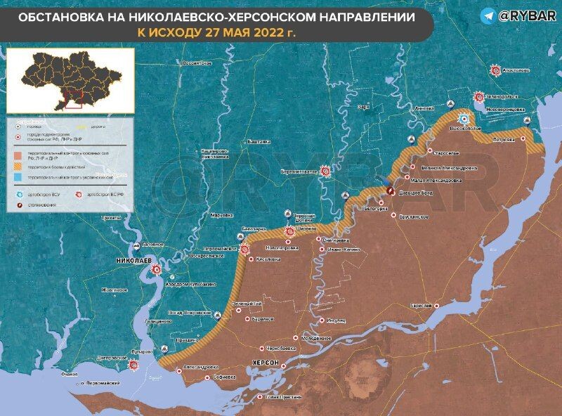 Утром 27 мая механизированная группировка ВСУ при поддержке более 10 единиц техники предприняла попытку прорыва обороны в районе ДАВИДОВА БРОДА по направлению на БЕРИСЛАВ, однако была рассеяна. Часть украинских сил оказалась в оперативном окружении у БРУСКИНСКОГО. Столкновения на участке продолжаются.