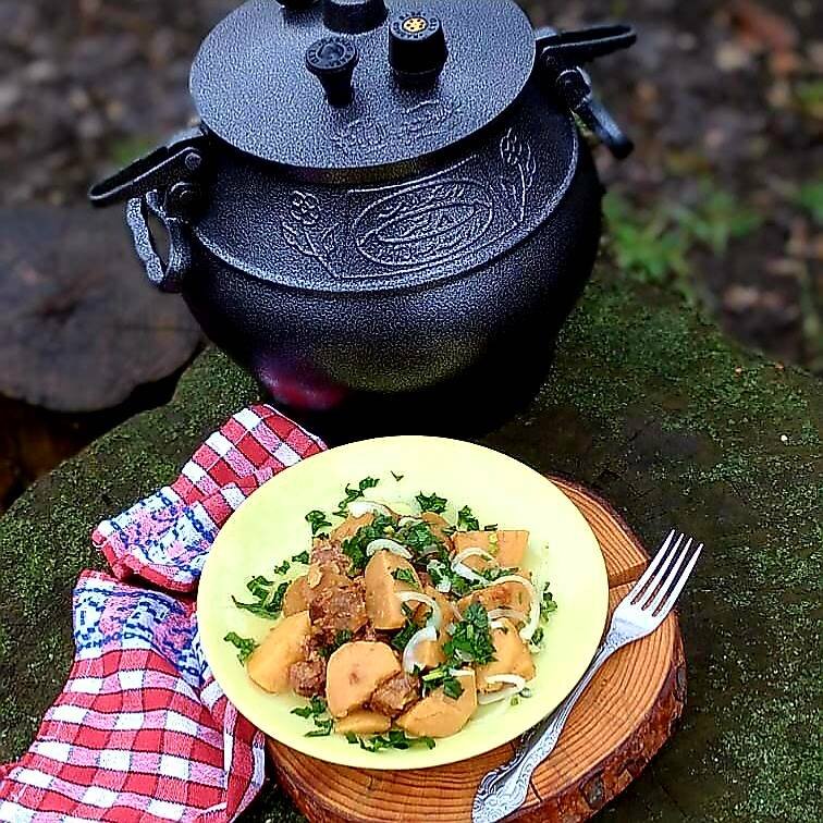 Перед тем, как открыть крышку, не забудьте спустить пар через клапан. Жаркое перемешать. Можно посыпать зеленью и маринованным луком. Приятного аппетита!