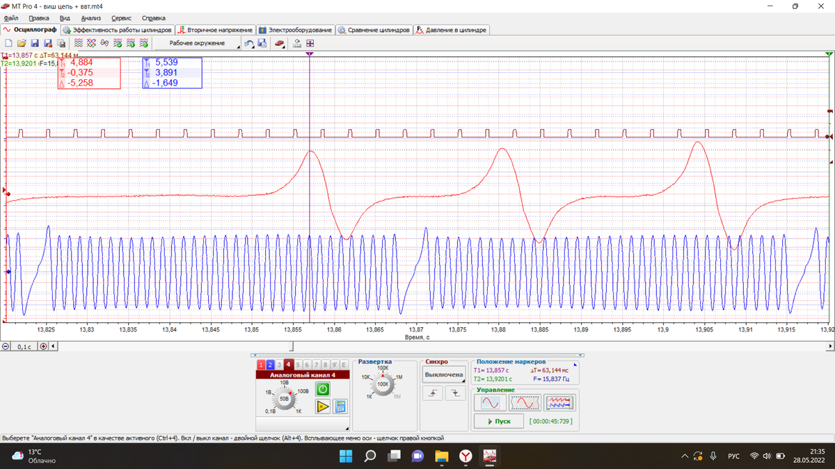 Двигатель 1ZZ ДПКВ-ДПРВ, работа VVT-i Эталон положения распредвала по отношению к коленвалу ничем не отличается от серии NZ, поэтому хочу показать как работает система VVT-i На 4 канале сигнал управляющего импульса клапана VVT-i и как видно на холостом ходу он не оказывает никакого влияния, всем известно что при активизации клапана со сканера нормально работающий двигатель почти мгновенно глохнет, на следующей осциллограмме хорошо видно из-за чего. На управляющем проводе сигнал ШИМ становится настолько частым, что приводит к полному открытию клапана и смещению впускного распредвала в крайнее положение(максимально раннее), из-за чего двигатель глохнет. С помощью линейки легко определяем что максимальный угол поворота распредвала 36 градусов. И напоследок осциллограмма с заклинившем клапане VVT-i, двигатель работал не устойчиво, не развивал полной мощности(машина приехала на диагностику с жалобами что троит), клапан VVT-i на активацию сканером не реагировал.