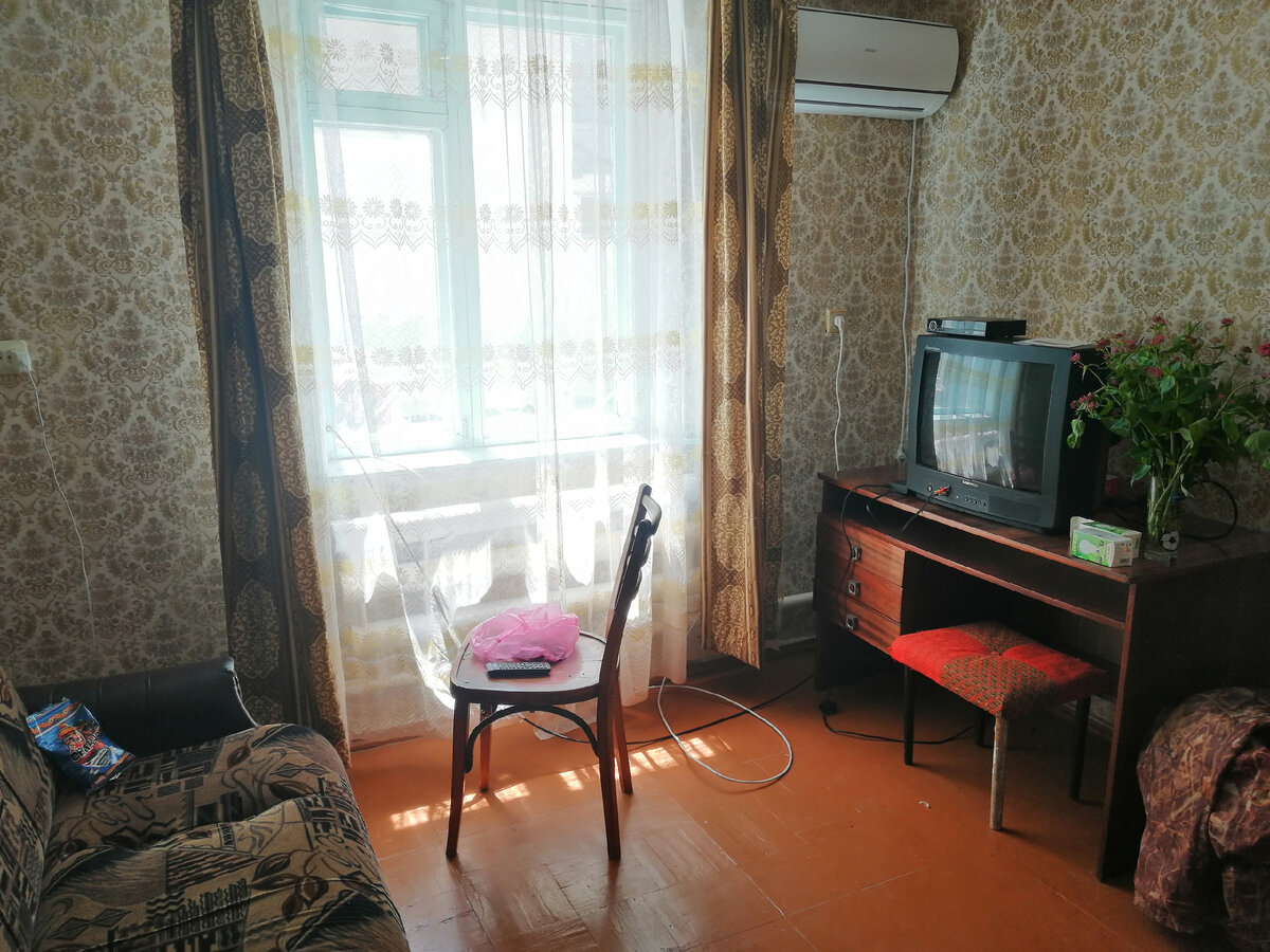 Чтобы заехать, пришлось проинспектировать некоторые углы, в особенности спальные места. Дедушке я предложила поселиться на диване в комнате с телевизором. Диван он лично попросил не раскладывать. Сказал, ему так удобно. Ну, а нам с мужем надо было проверить кровать. Старые матрасы были очень жесткие, потому я сразу купила новый. Кровать оказалась 180 см шириной. Никогда еще не спала на такой широкой кровати. Полный обзор первого этажа крымского старого домика можно посмотреть тут: Когда подняли матрас, оказалось, что кровать требует мелкого ремонта, иначе рискуем провалиться на пол во сне. Этим, конечно занимался муж, он ее скрепил, подделал, ну, а я внесла небольшие поправки в шторы. Повесила свои любимые занавески и шторы из Москвы, которые ждали своего часа, и в бытовке им место не нашлось. И сразу спальная, как по мне, преобразилась в более светлую и уютную даже без глобального ремонта. С красными шторами она была довольно мрачная. Также я проинспектировала трюмо, ох как я люблю