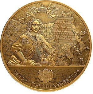 Тираж золотой монеты номиналом 10 000 рублей будет составлять всего 50 штук. На лицевой стороне отчеканены рельефные изображения портрета Петра I. Российский самодержец изображен с императорскими регалиями, рядом изображения ангелов, которые поддерживают корону. На фоне карта Российской империи и изображение стелы с аллегориями империи. На обратной стороне традиционно изображен герб РФ, а также проба, порядковый номер, номинал и масса. Страна-эмитент: Российская федерация Номинал: 10000 рублей Металл: золото 999 пробы Диаметр: 100 мм Вес: 1000 г Чеканка: Санкт-Петербургский монетный двор. Тираж: 0,05 тыс. штук.