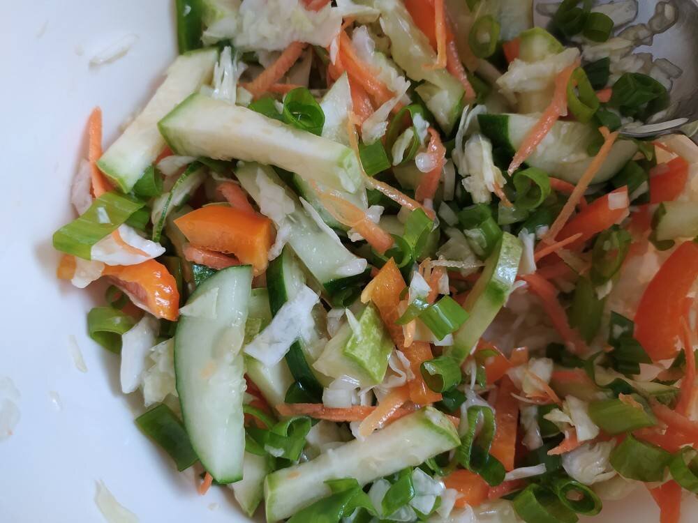 Ингредиенты: белокочанная капуста, огурец, морковь, молодой кабачок, болгарский перец, Репчатый лук по вкусу, Любая свежая зелень по вкусу (у меня зелёный лук), Соль по вкусу, ст.л растительное нерафинированное масло