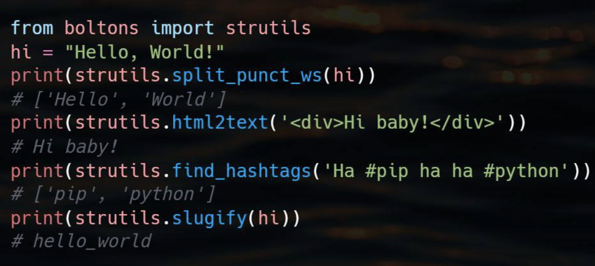 В библиотеке много интересных утилит, дополняющих стандартную библиотеку языка. Сегодня остановимся на strutils, которая фокусируется на работе со строками. На картинке показано, как можно легко разделить строку по знакам пунктуации, вытащить текст из HTML и найти хештеги в строке. Документация утилиты: https://boltons.readthedocs.io/en/latest/strutils.html Ниже приведены 3 примера кода, показывающих, как использовать Boltons.iterutils.remap(). Эти примеры взяты из проектов с открытым исходным кодом. #python