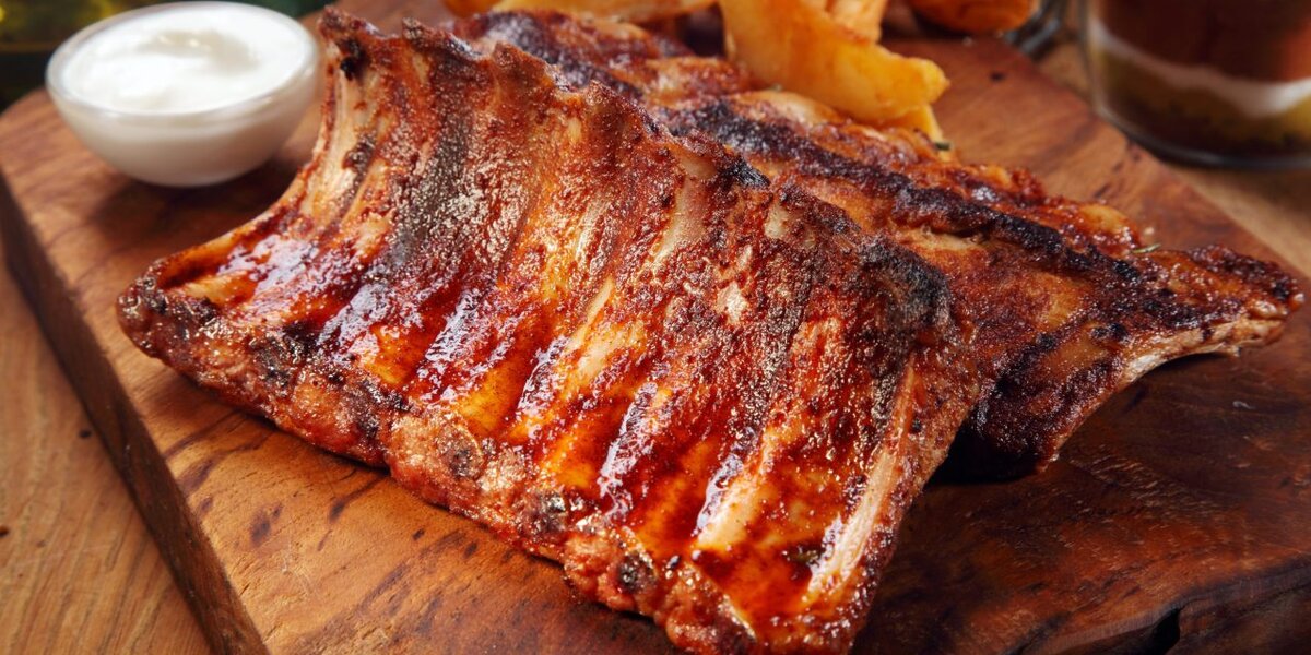 В основе барбекю — кетчуп и тростниковый сахар. Рёбра получаются очень ароматными и красивыми. Они отлично сочетаются с пивом, а их вкус хорошо оттеняют кисло-сладкие соусы. Ингредиенты Свиные рёбра с мякотью 1 кг Кетчуп 8 ст. ложек Тростниковый сахар 8 ст. ложек Соевый соус 2 ст. ложки Вустерский соус 2 ст. ложки Сладкий соус чили 2 ст. ложки Паприка 1 ч. ложка Приготовление 1․Для рецепта нужен целый кусок свинины с рёбрами. При помощи ножа снимите с него прозрачную плёнку. Если на отрубе слишком много жира, срежьте — его должно быть не больше сантиметра. 2․Смешайте все остальные ингредиенты в небольшом сотейнике. Поставьте на огонь, доведите до кипения и держите ещё около 2 минут. 3․Натрите рёбрышки маринадом, уложите в небольшую посуду и отправьте в холодильник на некоторое время: от 4 до 24 часов. Периодически рёбрышки стоит переворачивать, чтобы они лучше пропитались. 4․Если готовите на гриле, обжаривайте рёбра с обеих сторон примерно по 20 минут. Время от времени смазывайте остав