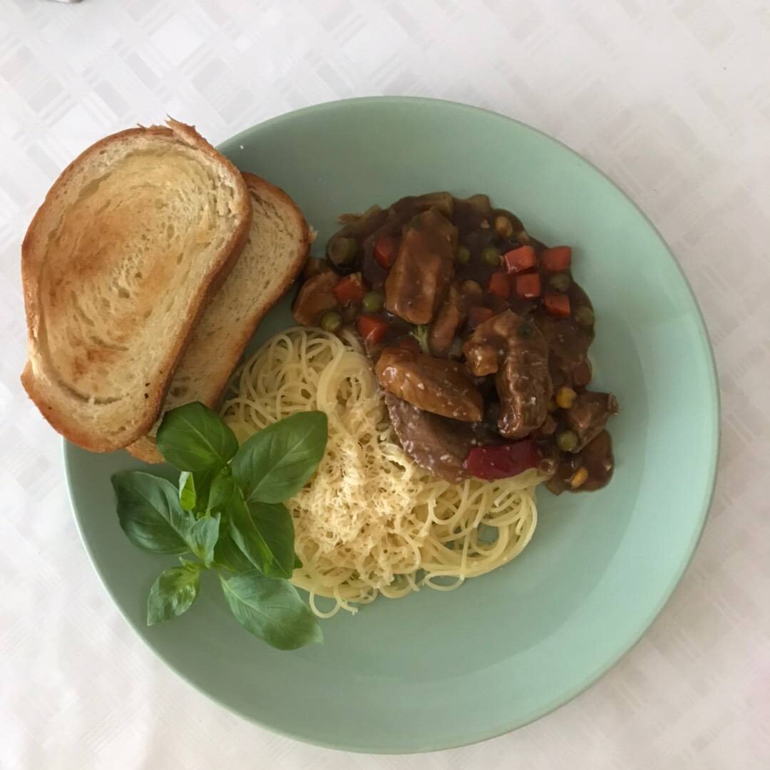 Свинина в соусе терияки. При подаче можно обжарить чиабатту и добавить пару веточек базилика для пряности и радости :). Ингредиенты: Свинина , Лук, Овощная смесь , Чеснок, Базилик, Соус терияки, соевого соуса, воды, мёда, яблочного уксуса, крахмала Способ приготовления: Нарезать свинину аккуратными кусочками. Нарезать лук полукольцами. Жарим мясо до золотистой корочки на подсолнечном масле. Обжариваем лук и овощную смесь. Добавляем к овощами мясо, мелко нарезанный чеснок и базилик. Готовим соус: 1. Полстакана соевого соуса 2. Полстакана воды 3. 2 столовой ложки мёда 4. 2 столовой ложки яблочного уксуса 5. 3 столовой ложки крахмала Мешаем все до однородной массы и добавляем к мясу. Тушим минут 7. В это время можно приготовить спагетти и подавать на стол).