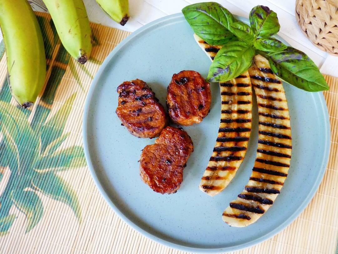 Задают тон блюду два нюанса, первый - маринад из копчёных специй, а второй - глазирование крем-бальзамиком с бренди и мёдом👌😌 #свинаявырезка #мясо Ингредиенты: свиной вырезки, банана, Для маринада, оливкового масла, копчёной паприки, копчёной соли, перца чипотле, Для глазури, бренди, крем - бальзамика, мёда Способ приготовления: 👩🏻🍳Бананы лучше всего использовать зелёные, они менее сладкие, хорошо держат форму на гриле. Вырезку зачистила от жира и плёнок. 👩🏻🍳Нарезала мясо на медальоны и прошлась по нему тендерайзером. 👩🏻🍳Получилось и слегка отбить медальоны и проколоть. Все эти действия необходимы для лучшего проникновения маринада во внутрь вырезки. 👩🏻🍳Все компоненты маринада смешала между собой. 👩🏻🍳Втерла маринад в медальоны и оставила мариноваться минут на 30. 👩🏻🍳Приготовила глазурь для вырезки, в миске смешала бренди, мёд и крем-бальзамик. 👩🏻🍳Замаринованные медальоны обжарила на гриле, по пять минут с каждой стороны. 👩🏻🍳Затем каждый медальон покрыл