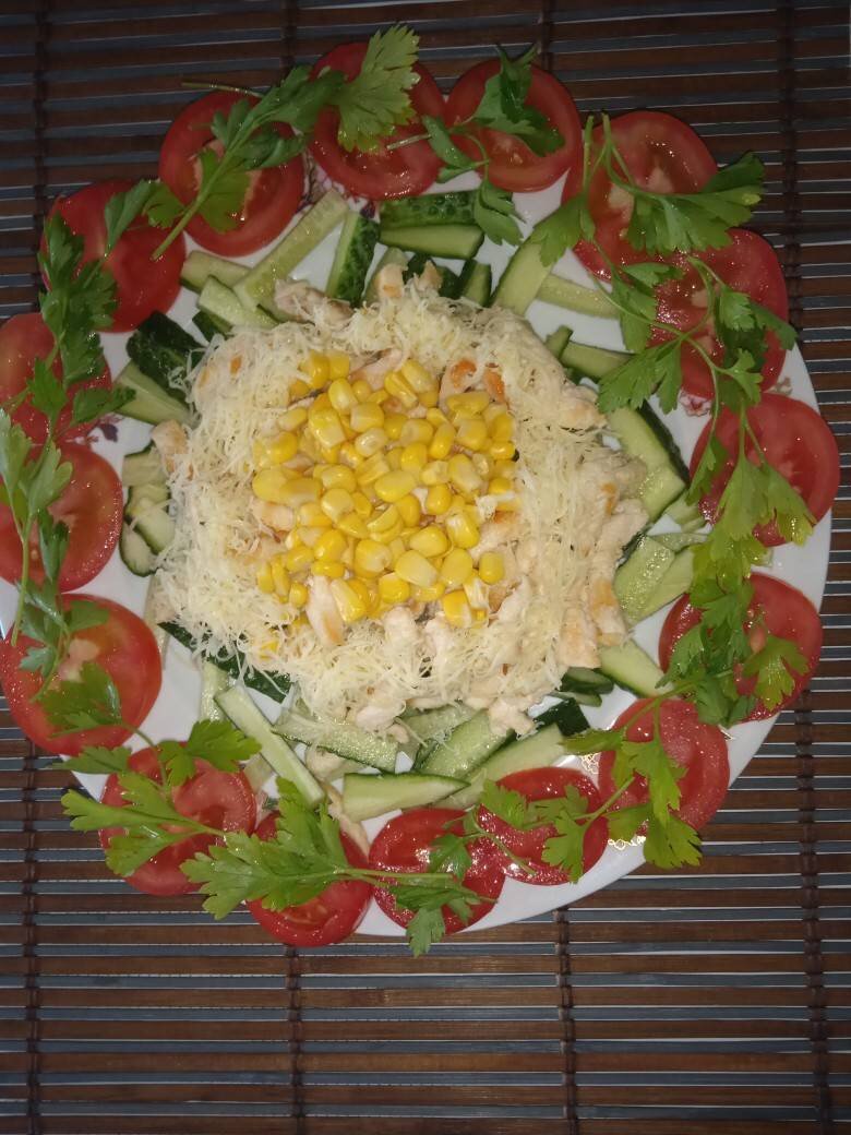 #вишиванка Ингредиенты: огірков, помідорки, сиру, курячого філе, консервованої кукурудзи, Петрушка, Зернова зира, Сіль, Соняшникова олія для смаження Способ приготовления: Огірки порізати смужками. Виложити першим слоєм на широке блюдо. Порізати також тоненькими смужками філе. Обсмажити на сковородці до зототистої скоринки. Додати сіль та зиру зі смаком. Виложити поверх огірочков горкою. Теперь викладаємо поверх курки кукурудзу. Нарізаємо помідори кружочками, та викдадаємо їх навколо огірків. Теперь натіраємо на маленьку терку сир, та викладаємо його поверх курки, яка залишилася неприкритою. Тепер прикрасимо помідори петрушкою.