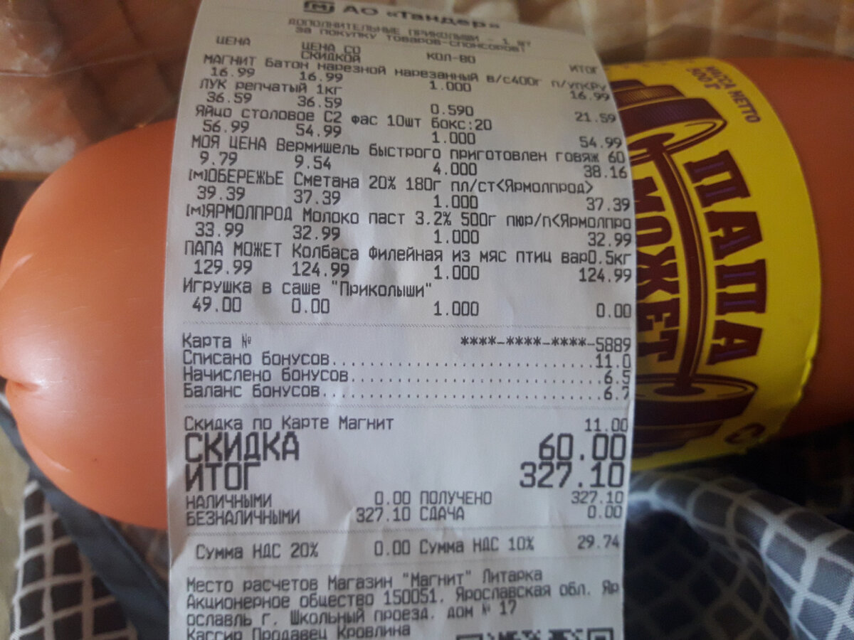 Закупки в субботу, в которую я работала. Купила на 327 рублей, а скидка была 60 рубей