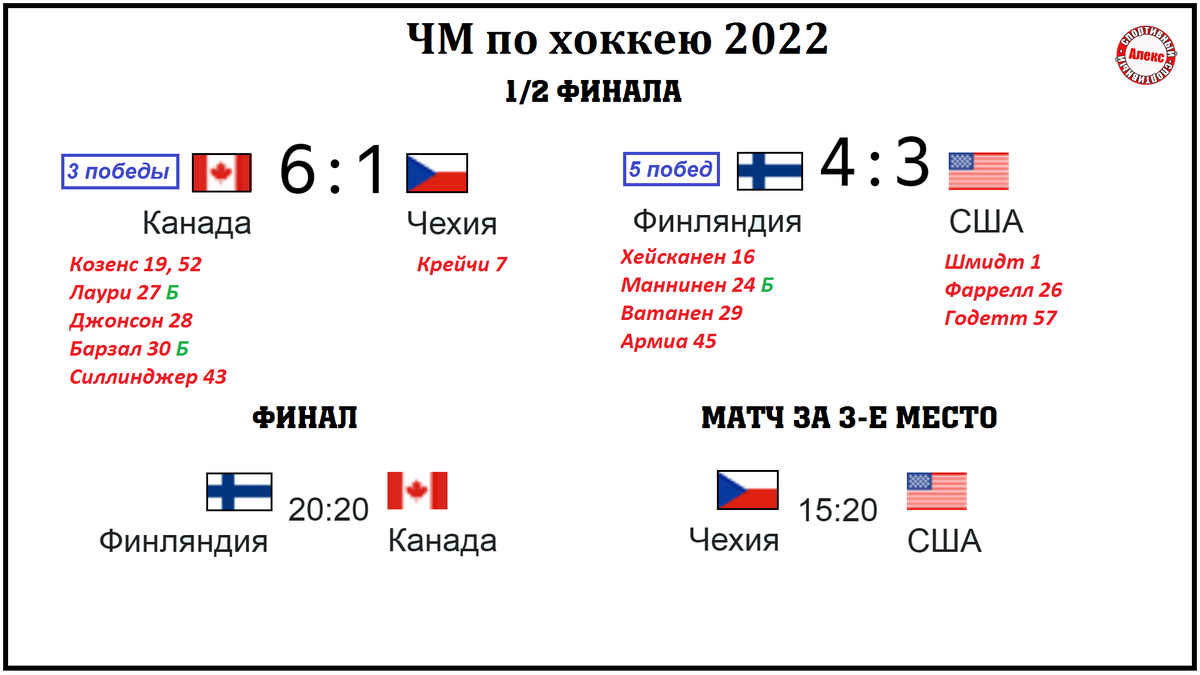 Привет, добрые. На чемпионате мира начались топовые игры. Кто вышел в финал, когда матчи и кто самый слабый? Финляндия обыграла США 4:3. Так получилось, что команды выступали в одной группе, где финны выиграли 4:1. В той игре было 45 минут штрафа на двоих. Финляндия одержала 5-ю победу кряду, и вышла в финал. В этих играх команда Юкки Ялонена забросила в среднем 4 шайбы за игру. Канады разгромила Чехию 6:1. Сложно поверить, но сборные последний раз встречались 3 года назад. «Кленовые листья» выиграли ту игру 5:1. Молодой Дюбуа забросил одну из шайб. Канада одержала 3-ю победу кряду. В этих играх команда Клода Жюльена забросила в среднем 5,6 шайбы за игру. Расписание. Из этих четырех команд самой слабой является Чехия, потерпевшая 4 поражения на турнире, у США - 3. Пишите, кто победит, а я расскажу о лучших хоккеистах. Дюбуа из Канады – лучший снайпер, 7 шайб. Червенка из Чехии – лучший ассистент, 11 передач и 15 очков. В прошлом выпуске я рассказал, как формируются пары плей-офф. С ва
