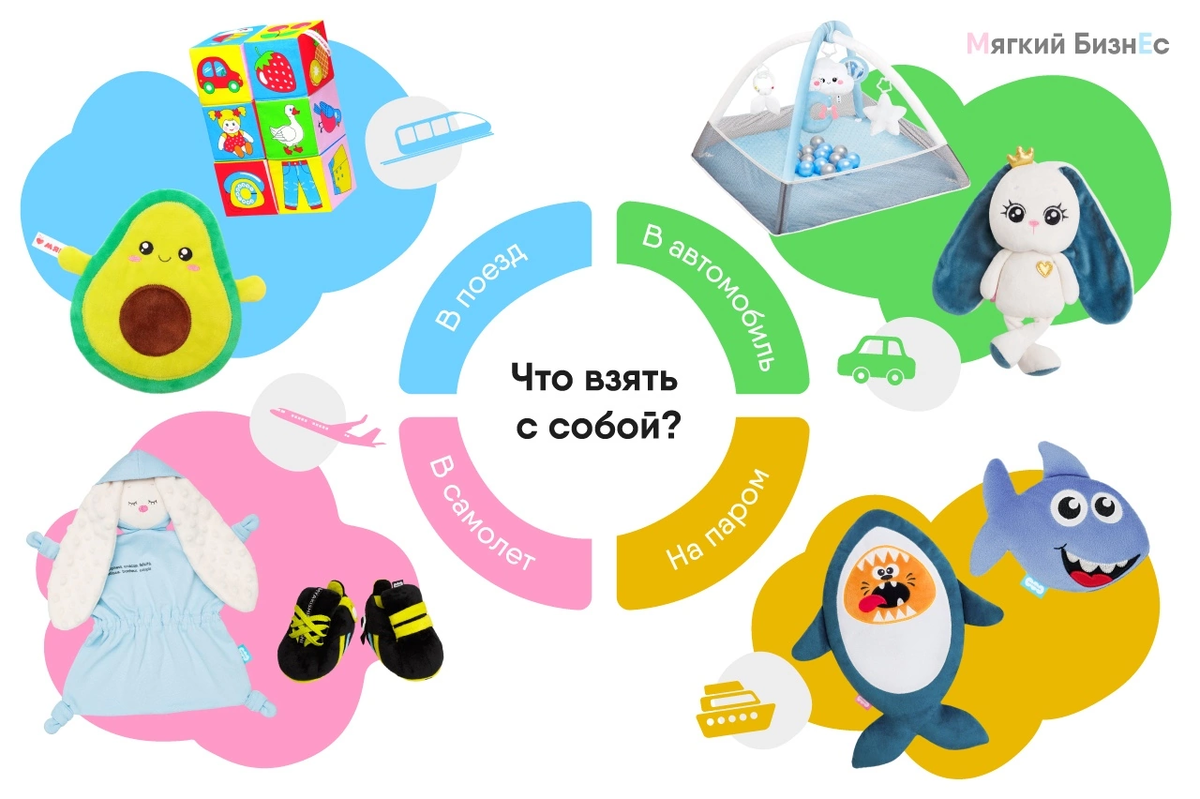 Путешествие с детьми - это всегда обоснованные переживания. Хочется хорошенько подготовиться, чтобы избежать возможных трудностей. Главное - это быть готовым к непредвиденным обстоятельствам и иметь в походной сумке нужные вещи. Что же важно взять с собой? 1.Игрушки для детей Берите с собой отвлекающие игрушки, раскраски, скачивайте мультфильмы, любимую музыку. Маленький ребенок чувствует себя в безопасности, когда с ним путешествует знакомый плюшевый друг. Учитывая габариты походной сумки, лучше брать многофункциональные игрушки. Чтобы полностью погрузиться в путешествие, выберите игрушку в соответствии с особенностями маршрута. Например: Такой походный набор аниматора позволит комфортно добраться до пункта назначения. 2.Одежду, аксессуары Посмотрите заранее погоду в тех местах, куда вы отправляетесь. Если по прогнозу стоит дождь, то позаботьтесь о дождевике или зонтике. Не сидеть же в гостинице и ждать у моря погоды. Прогулки под дождем совсем по-другому открывают город и даю