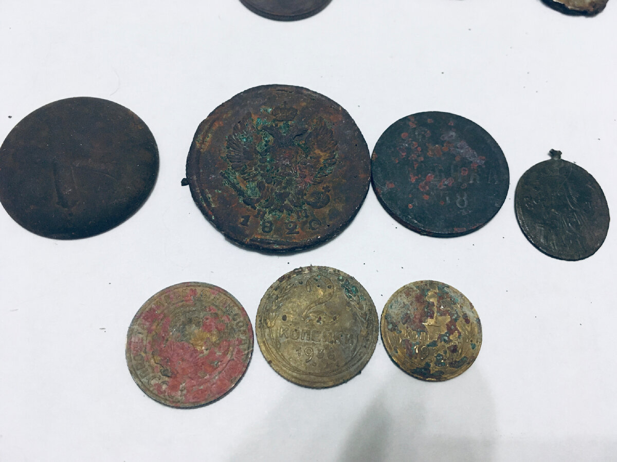Металлоискатель и мои находки. В основном это чёрный металл на приемку. Иногда попадались монеты. Самые ценные находки это пара царских и три ранних советских монет, а ещё пуговица. Эти монеты из меди и цветных металлов. А современные монеты из железа и быстро гниют. С такими монетами исторический период наших лет не оставит и следов. 50 копеек просто обернули в фольгу, а внутри кусок железки. Магнитом проверил рубли номиналом 1,2,5,10 все они из железа. Все мои находки за несколько раскопок. Попадались в основном 5 копеек 1991 и 50 рублей 1993. Копейку 1858 нашёл в яме с обрезками чёрного металла. Может была кузница или ремесленник жил. Ещё 2 копейки 1820 и это уже интереснее. Даже была копейка 1757, но она в очень плохом состоянии и я ее подарил. Поселение старое и там определённо есть что-то ценное. Как наладится погода я обязательно выкопаю ещё ценные находки. Чистить их пробую в мыльном растворе или варю в соде. Окись сходит слабо, а вот испортить монету можно таким образом л