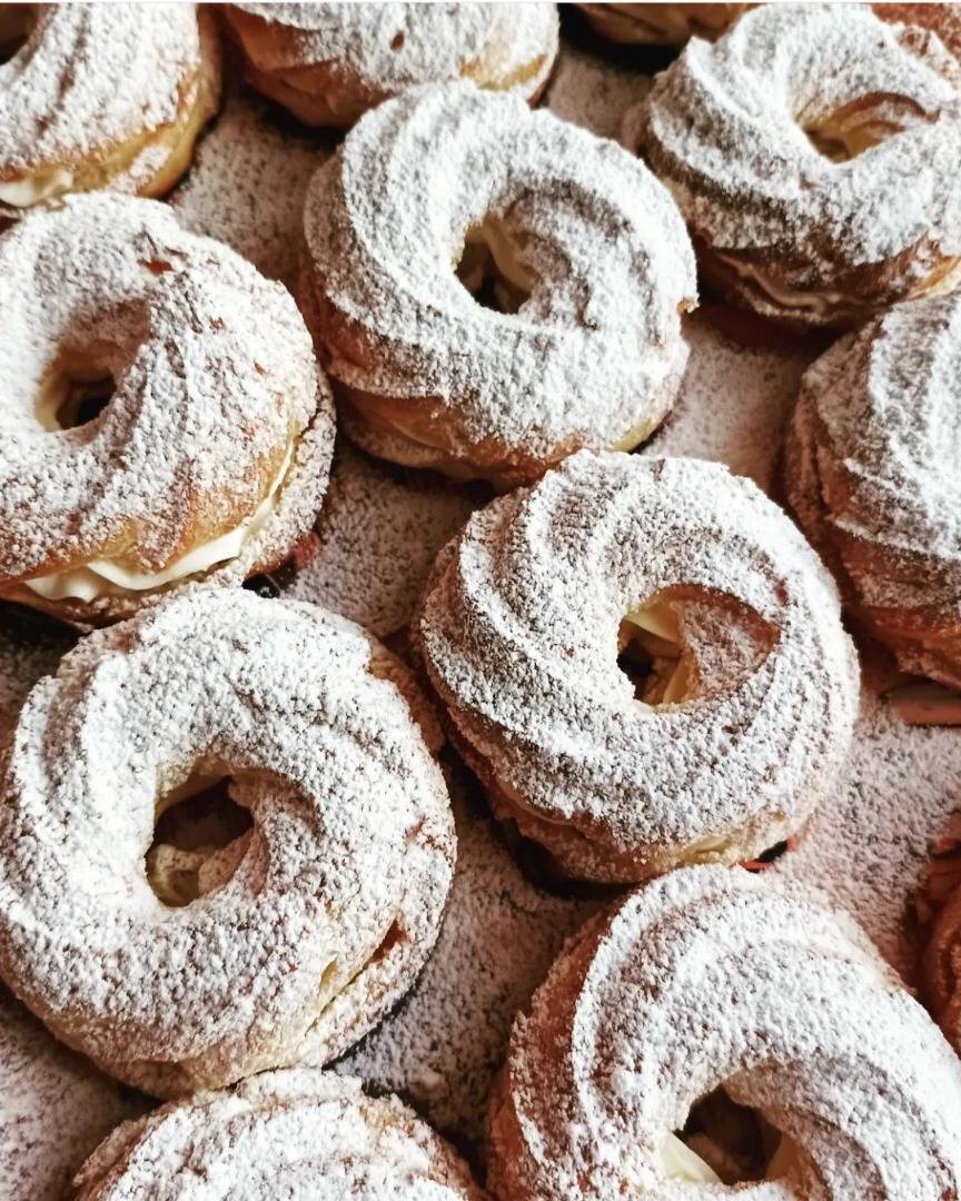 Дуже смачно і не затратно по часі. Головне мати кондитерський мішок з насадками. Діти оцінять😉 #вишиванка Ингредиенты: Вода , Молоко, Масло , Мука , Яйця , Цукор , Сіль , Крем:, Крем-сир , Вершків , Цукрова пудра Способ приготовления: 1. Молоко, воду, масло, цукор і сіль кладемо в сотейник, і ставимо на плиту. Доводимо до кипіння і одразу всипаємо всю муку. Тримаємо ще 5 хв на слабкому вогні. 2. Перекладаємо в інший посуд і даємо остудитися 5 хв. 3. Наступним вводимо яйця по одному добре вимішуючи. Все тісто готове. 4. Перекладаємо тісто в кондитерський мішок з насадкою зірка,і викладаємо кольца на пергаментний папір. 5. Випікати в розігрітій духовці до 180°C 20 хв, а ще потім 5 хв при t 160°C. 6. Остивші кольца розрізаємо горизонтально і начиняємо кремом за допомогою кондитерського мішка. 7. Крем: Сир і вершки (з холодильника) кладемо в миску, додаємо пудру і все збиваємо до плотності. 8. Зверху посипаємо цукровою пудрою.