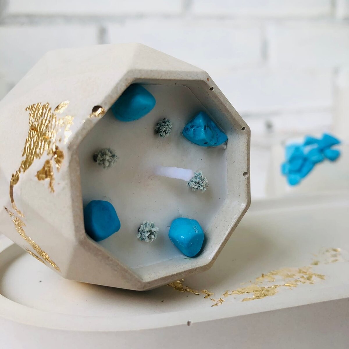 Вы уже видели в ленте этот синий минерал, который очень легко спутать с бирюзой. Сам по себе он достаточно редкий, и использовать его стали не так давно - если другие минералы известны человеку тысячи лет, то говлит был открыт всего лишь 2 века назад. Чем он поможет и какими свойствами обладает? ✨ снимает агрессию и устраняет беспокойство. Это работает в нескольких направлениях: минерал гасит негатив, исходящий от других людей, не даёт излиться агрессии самого владельца камня; ✨ убирает переживания и напряжение; ✨ успокаивает перед сном, позволяет избавиться от кошмаров и бессонницы; ✨ делает владельца более терпеливым и менее раздражительным, помогает забыть обиды, делает взгляд на людей и события более позитивным; ✨ смягчает характер, позволяет увидеть мир с новой стороны и найти источники вдохновения. Свеча с говлитом отлично подойдет вам, если вы постоянно испытываете стресс, сильно нервничаете, переживаете моральное давление, сильно устаете на работе. Для этого свечу нужно