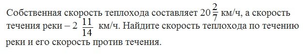 Сложение и вычитание дробей с разными знаменателями Уважаемые мамы и папы, дедушки и бабушки! Предлагаю решение задачи номер 285 из 7-го издания учебника по математике для 6-го класса авторов А. Г. Мерзляка, В. Б. Полонского и М. С. Якира под редакцией. В. Е Подольского. Условие задачи: Решение: Если бы скорости теплохода и течения реки были бы целыми числами, то такую задачу решили бы даже школьники младших классов – просто для движения вниз по течению скорости бы сложили. А для движения вверх – вычли бы из скорости теплохода скорость течения. Но эта задача на правило сложения и вычитания дробей с разными знаменателями (§10): Чтобы сложить (вычесть) две дроби с разными знаменателями, надо привести их к общему знаменателю, а затем применить правило сложения (вычитания) дробей с одинаковыми знаменателями. 1. Считаем скорость вниз по течению: 2. Теперь находим скорость против течения реки: Дробная часть уменьшаемого меньше дробной части вычитаемого, поэтому вычитаемое нужно изменит