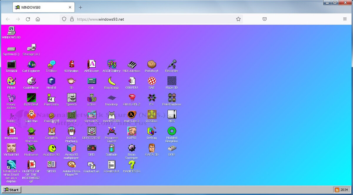 #nns_info #nns_link В 2014 году французские художник и диджей Jankepopp вместе с командой выпустили сайт https://windows93.net/ С 1990 по 1994 год было выпущено семейство «Windows 3.x». В 1995 - «Windows 95». То есть, «Windows 93» к компании «Microsoft» никак не относится. Эмулятор запускается под звуки «Sony PlayStation 1». На рабочем столе найдете: – Иконку вируса hydra.exe. – Браузер «CatExplorer» с рабочим поисковиком «SkyNet». – Виртуальный помощник «Скрепка» из «MS Office». – А так же: старые игры, программы, файлы, картинки, терминал и тому подобное. Источник Читайте нас в «ВК», «Одноклассниках», Telegram и Teletype