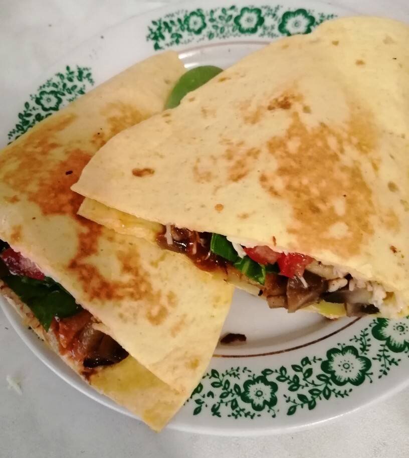 #непп Ингредиенты: тортильи, куриная грудка, шампиньоны, помидор, лук репка, перец болгарский, картофель крупный, сыр твёрдый, кетчуп, хмели-сунели, зелень руккола, салат, соль, перец, растительное масло для жарки Способ приготовления: Обжарить лук до полуготовности, добавить шампиньоны, соль, перец. Жарить на медленном огне. Готовые грибы переложить в миску. В эту же сковороду положить нарезанную куриную грудку, обжарить до готовности, добавить соль, перец. Перемешать с грибами. Картофель очистить, нарезать соломкой, поджарить. Натереть на мелкой терке сыр. Кетчуп перемешать с хмели-сунели. Зелень помыть, дать стечь воде. Помидоры нарезать кружочками, перец нарезать соломкой. На половину тортильи насыпаем сыр, затем картофель, курицу с грибами, полить кетчупом. Затем выложить кружки помидора и перец, посыпать сыром и разложить листья зелени. Накрыть другим краем лепешки. Обжарить кесадильи с обеих сторон. Я в сковороду добавила немного растительного масла. Подавать горячими.
