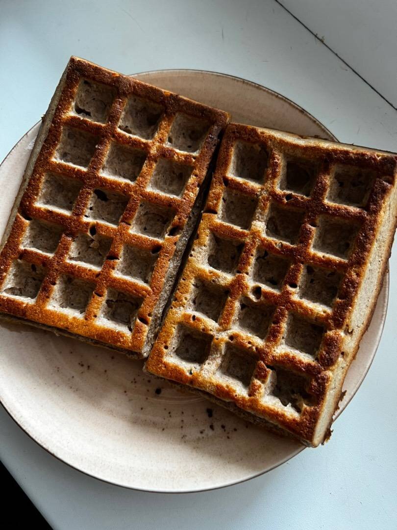 Эти вафли отлично подойдут для завтрака и перекуса. Калорийность невысокая, а белка очень много! Одна вафля у меня получилась примерно 80 грамм. На всё количество 315 гр : Ккал: 539 Ж: 35,1 Б: 90,7 У: 57,3 На 100 гр: Ккал: 171 Ж: 11,1 Б: 28,7 У: 18,1 Ингредиенты: Отруби пшеничные, Протеин сывороточный (у меня шоколадный), Мука кокосовая, Творог, Молоко, Яйцо, Разрыхлитель , Ванилин, Подсластитель (у меня эритрит), Соль Способ приготовления: Смешать все сухие ингредиенты. Яйцо перебить с творогом в блендере. Добавить сухие ингредиенты и молоко и взбить ещё раз. Дать постоять пару минут и выложить в форму (у меня силиконовая). Выпекать 15 минут при температуре 180 градусов.