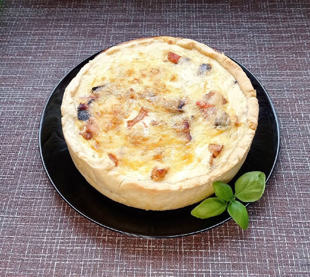 #непп Форма д-18 см Ингредиенты: Тесто, муки, сливочного масла, соли, воды, Начинка, грибов, куриного филе, луковица, помидор, соли, сыра, Заливка, яйца, сливок, соли, Дополнительно, Растительного масла для жарки, Фасоли или нута, Муки на подпыл Способ приготовления: Тесто: в миску выложить масло и муку, измельчить в крошку. Добавить соль и воду. Замесить тесто. Тесто убрать под плёнку в холодильник на 10 мин. Начинка: на растительном масле обжарить грибы. Добавить курицу и лук. Обжарить. Добавить помидор и обжарить ещё минут 5. Сыр натереть на терке. Заливка: взбить яйца со сливками и солью. Тесто достать из холодильника. Рабочую поверхность подпылить мукой. Раскатать круг. Выложить тесто в форму. Обрезать края. Насыпать фасоль или нут (по желанию) и отправить основу в духовой шкаф на 15 мин при температуре 190° верх/низ конвекция. Достать основу и удалить крупу. Выложить слоями обжаренную начинку с сыром. Налить в пирог заливку и поставить в духовку на 30-35 мин, но предварительно сн