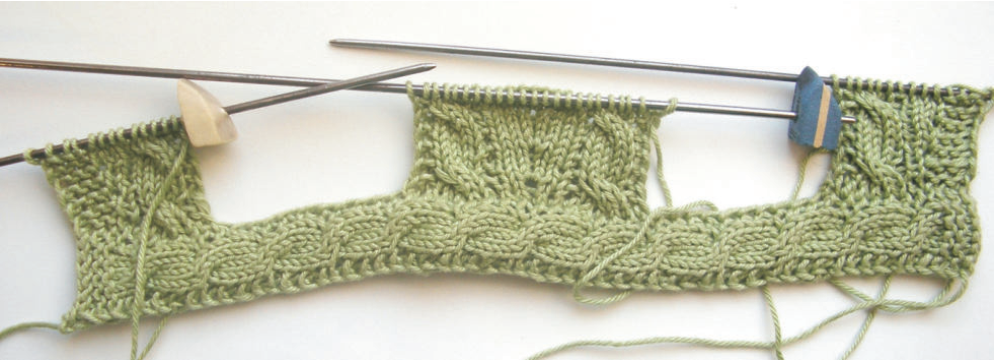 Расположить вязание следующим образом (см. фото ниже) и наложить левую сторону на правую. С правой спицы снять на дополнительную спицу 4 петли, вначале вязания провязать вместе лицевыми (первую петлю и левой спицы и первую петлю с дополнительной спицы, вторую петлю с левой спицы и вторую петлю с дополнительной спицы и т.д.) петли с левой и дополнительной спицы, располагая дополнительную спицу под левой.