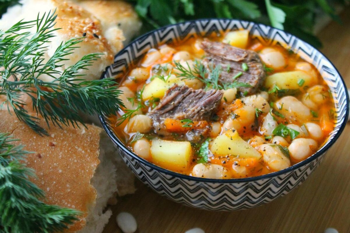 ПОНАДОБИТСЯ: ПРИГОТОВЛЕНИЕ: 1. Предварительно вымочить на ночь бобы. Хорошо промыть, залить свежей водой, вскипятить и варить 10 минут. Слить бульон. 2. В большой котелок с горячим маслом положить, помешивая, бекон, говядину, лавровый лист, тмин, и мелко нарезанный лук, чеснок, сельдерей, морковь. 3. Добавить бобы, томаты, уксус, воду и перемешать. Поставить котелок на средний огонь и готовить полтора часа. 4. К готовому супу подать тосты с сыром. ПРИЯТНОГО АППЕТИТА !