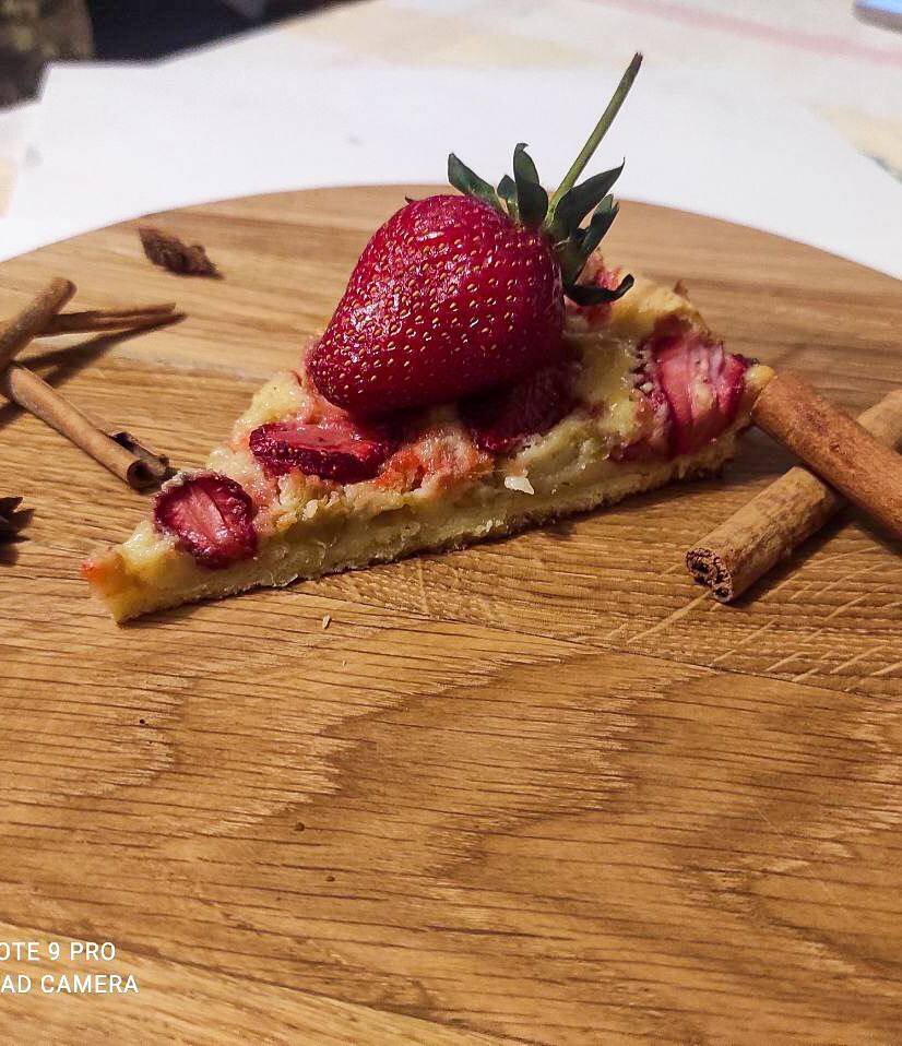😋 Ингредиенты: Масло вершкове, Цукор, Цедра апельсина , Яйце куряче, Борошно пшеничне, Сіль, Ванільний цукор, Ревінь стеблини, Полуниця Способ приготовления: Крок #1 З’єднуємо 155 г розм’якшеного масла, 60 г цукру і цедру та починаємо змішувати. Змішуємо до кремоподібної текстури, потім додаємо 1 яйце і продовжуємо змішувати, поки суміш не збільшиться трохи в об’ємі. Потім додаємо 227 г борошна і сіль. Після цього перемішуємо, щоб усі інгредієнти добре змішалися (2-3 хв). Тісто збираємо у плівку та прибираємо у холодильник на 2 год. Перед випіканням витягаємо з холодильника і розкочуємо тісто по формі. Крок #2 Переходимо до вершкової начинки. У сотейнику прогріваємо 170 г масла з ваніллю до бурштинового кольору приблизно 10 хв. На цьому етапі процідіть масло через марлю, щоб позбутися від осаду. Крок #3 Параллельно збиваємо в іншій мисці 2 яйця, 150 г цукру і 40 г борошна. Після проціджування влийте масло у суміш з яєць, борошна та цукру, постійно збиваючи. Охолодіть до кімнатної темп