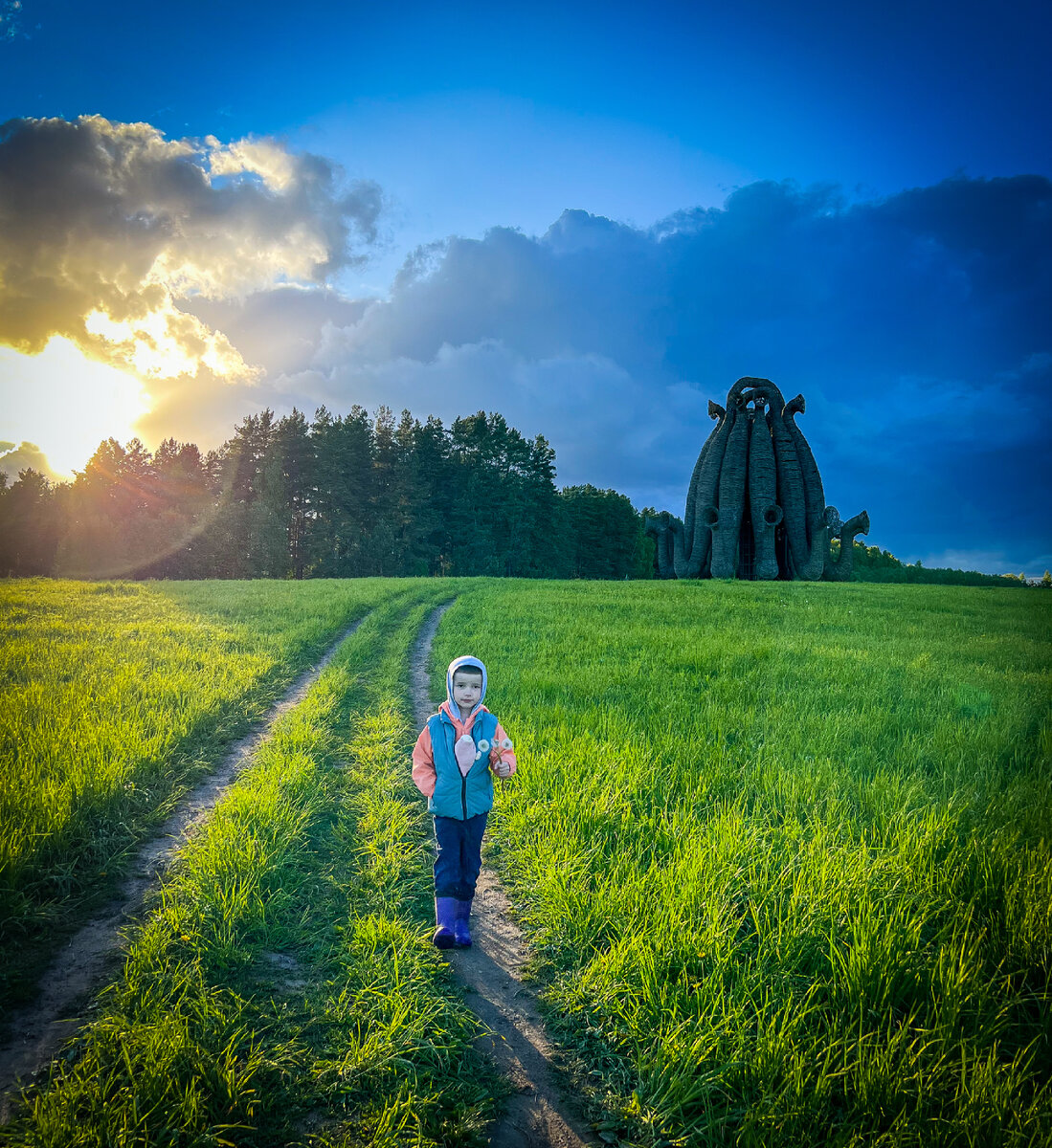 До того, как я съездила в Никола-Ленивец, по фото я была уверена, что это российский аналог Burning man. Тоже по фото и видео, на Берне я не была. Но нет. Вообще не то. Разве что жгут раз в год один арт-объект. Но жгут на Масленицу. Как я поняла концепцию арт-парка Никола-Ленивец: это арт-объекты, преимущественно из природных материалов, которые вписаны в ландшафт. Причем очень органично. Или из леса выходишь, а там стоит нечто, и это нечто идеально создано тут стоять. Или, еще лучше, арт-объект улучшает ландшафт. Например мост через болото. Болото сильно живописное, такое колоритное русское, с жабами. Но в центре болота никак не оказаться, кроме как по арт-мосту. Или, арт-объект дополнительно смотровая площадка. Смотреть на просторы, или на закат. И суть концепции в том, что мы гуляли по лесам, лугам, болотам, берегам реки от одного арт-объекта к другому. Параллельно любуясь пейзажами.