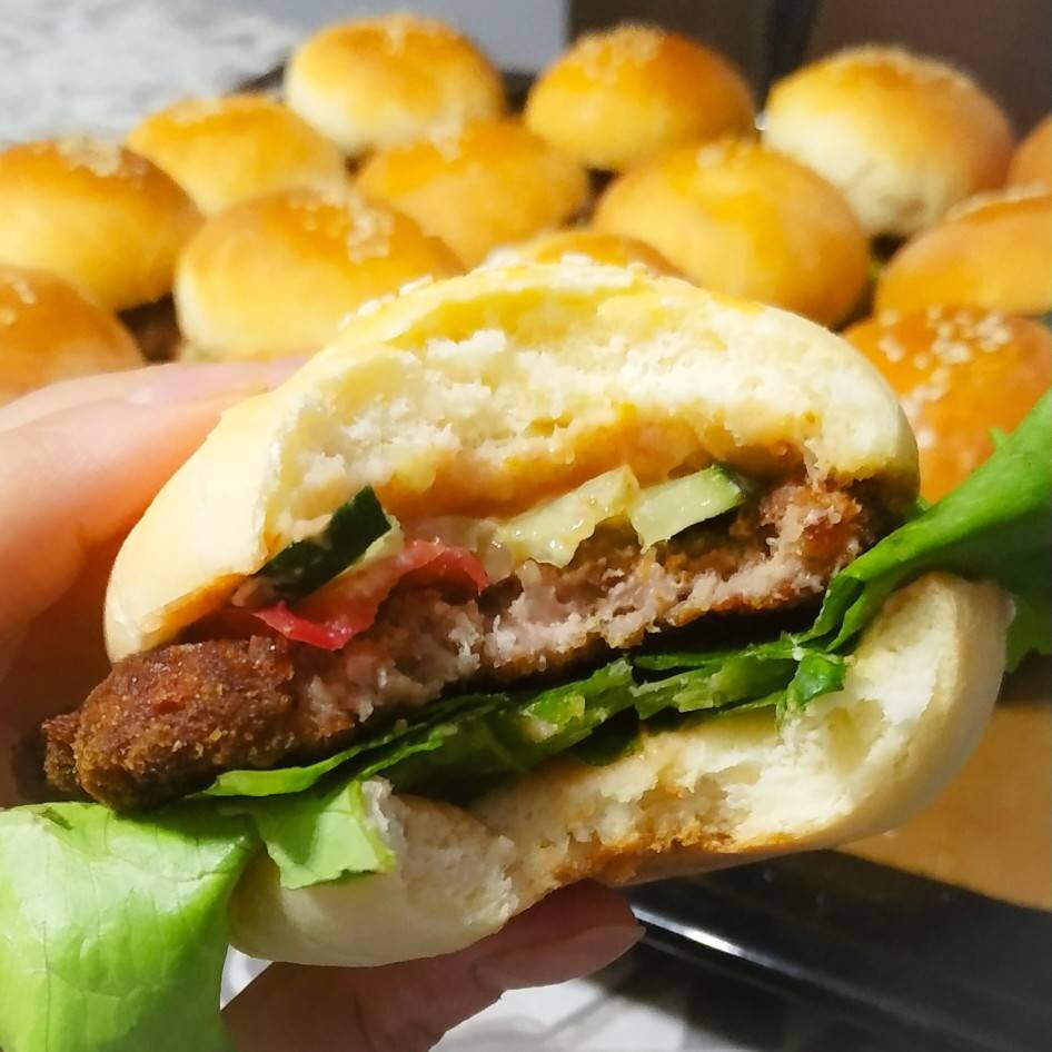 Ингредиенты: Тесто для булочек, молока, кефира, дрожжи сухие, сахар, соль, растительного масла, яйца, муки, Фарш для котлет, говядина, свинина, репчатый лук, яйца, муки, Панировочные сухари, Начинка, огурец свежий (можно соленый), помидор, лук, листьев салата, Кетчуп, майонез, горчица Способ приготовления: Готовим булочки. Смешать молоко с кефиром, немного подогреть, добавить соль, сахар, дрожжи. Как подойдут дрожжи, добавить к ним растительное масло, 2 яйца, хорошо перемешать. Влить в просеянную муку. Замесить тесто. Накрыть и убрать в теплое место на 40 мин или час. Сформировать небольшие колобки. Выложить на противень. Дать постоять ещё 20 минут. Верхушки булочек смазать яйцом и посыпать кунжутом. Духовку разогреть 180°. Выпекать 10-20 минут. Зависит от размера булок и духовки. Перекрутить мясо и лук через мясорубку, посолить, поперчить. Добавить яйца, муку. Делать тонкие котлеты. Обвалять в панировочных сухарях. Жарить с обоих сторон на растительном масле, придавливая лопаткой, 10