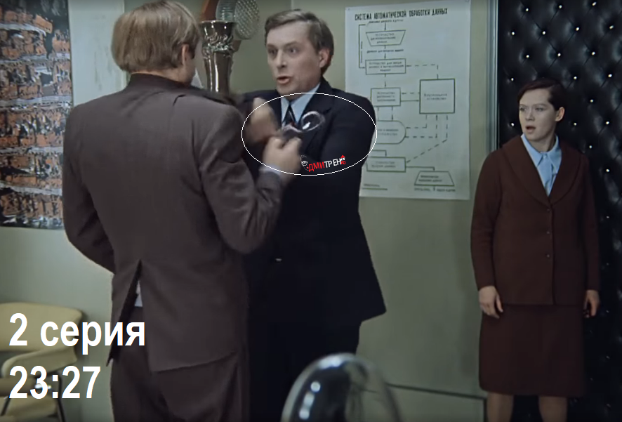 Второй недочет наблюдайте буквально через минуту, когда Калугина останется наедине с буяном. Обратите внимание, что очки, которые находятся в руках у директора на секунде 24:36, после смены кадра, через 3 секунды, чудесным образом оказываются перевёрнутыми. Посмотрите сами и убедитесь. Думаете, Калугина жонглер?