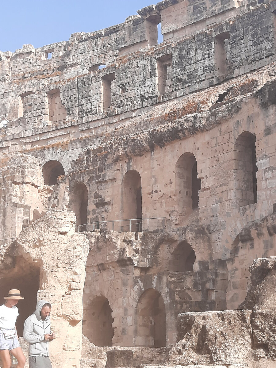 В Тунисе Колизей был построен по подобию Римского., проконсулом Гордианом. Длина арены амфитеатра составляет 65 метров, а вместимость составляет 30 тыс. человек(!) Что согласитесь довольно много для тех времен. Амфитеатр ( да и сам Колизей), выглядят довольно внушительно. Наверху расположены ложи, а внизу клетки, где содержались хищники и гладиаторы. Поражает и величина амфитеатра( хоть и незаконченного) и весь вид. Но самое поразительное, это когда спускаешься вниз. Несмотря на то что клетки находятся на воздухе, такое впечатление, что воздух пропитан запахом крови. Он буквально преследует по всему " подземелью". Находясь там, ты буквально погружаешься , переносишься, на несколько тысячелетий назад. Ощущаешь всей кожей ,что тут могло происходить... По рассказу гида, здесь снимался фильм Гладиатор. Вот только, если верить источникам, в Тунисе фильм ,никогда не снимался. Снимали его в Германии и Мальте. Где специально были построены декорации имитирующие настоящий Колизей. Правда