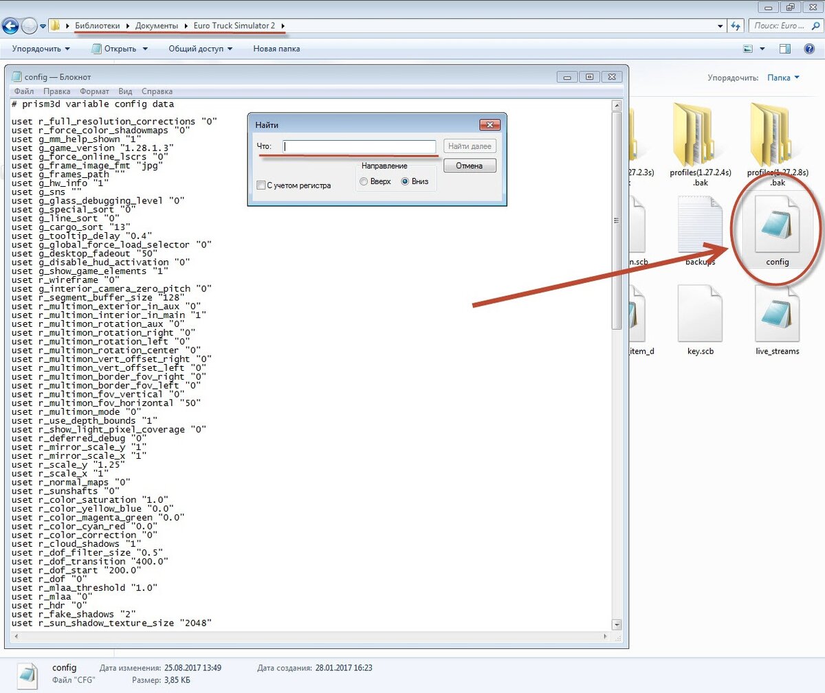 Находим файл config.cfg и открываем его в блокноте. Чтобы не искать в ручную нужные параметры, используйте сочетание клавиш Ctrl+F и вводите нужную вам строчку. В данном случае я не буду рассматривать весь файл, а лишь опишу основные параметры, которые имеет смысл менять.