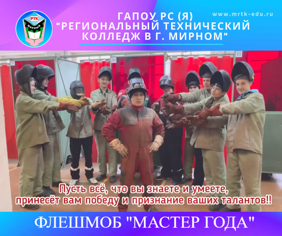 Флешмоб "Мастер года" - поддержи лучшего мастера производственного обучения МРТК Евгения Ильина. Республика Саха (Якутия) и ГАПОУ РС(Я) «Региональный технический колледж в г. Мирном» присоединяется к флешмобу «Мастер года» и поддерживает лучшего мастера производственного обучения - Ильина Евгения Дмитриевича! Лайкаем и оставляем свои комментарии в поддержку по ссылке: https://vk.com/wall-212337635_1207 Екатерина Сыбенова, заведующая методическим отделом ГАПОУ РС (Я) "МРТК". Пресс-служба ГАПОУ РС (Я) «Региональный технический колледж в г. Мирном». #МРТК #Мирнинскийколледж #РегиональныйтехническийколледжвМирном #СПО #Якутия #Мирнинскийрайон #Алмазныйкрай #Мирный #мастергода #мастергодафлешмоб Ссылки по теме: