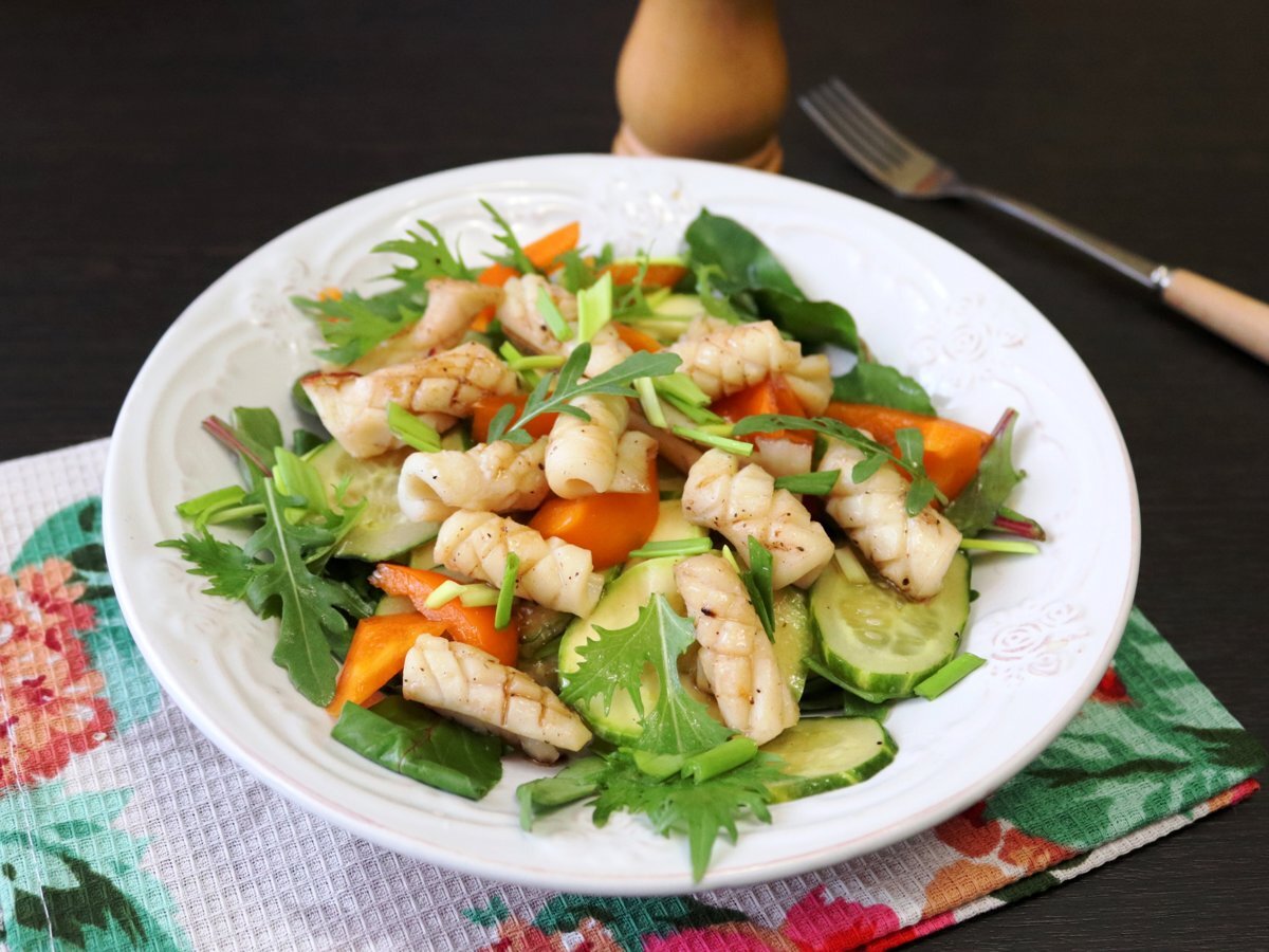 Лёгкий и хрустящий салат с кальмарами, свежим огурцом и молодым кабачком. Ароматное кунжутное масло и соевый соус придают салату азиатский колорит. Ккал: 120.21, время приготовления: 40 мин. #Салаты и закуски #Восточная #Блюдо ПП #На ужин #Морепродукты Ингредиенты Маринад Приготовление: 1. Подготовить ингредиенты для салата. Овощей нужно взять примерно одинаковое количество. Кальмары (2-3 тушки) почистить от тёмной плёнки и хорошо помыть. 2. Приготовить маринад из соевого соуса, кунжутного масла, сока лимона и сахара. 3. Тонко нарезать кабачок и огурец. Сладкий перец нарезать соломкой. Полить половиной маринада и оставить на 15 минут. Овощи слегка промаринуются и обмякнут. 4. Добавить нарезанный зеленый лук. 5. Кальмары нарезать на пластины и сделать острым ножом сеточку, не прорезая насквозь. 6. Нарезать на широкие пластины, посолить, поперчить и обжарить на растительном масле 2-3 минуты. Кусочки кальмара красиво скрутятся. Дать остыть. 7. Собираем салат. На тарелку выложить микс