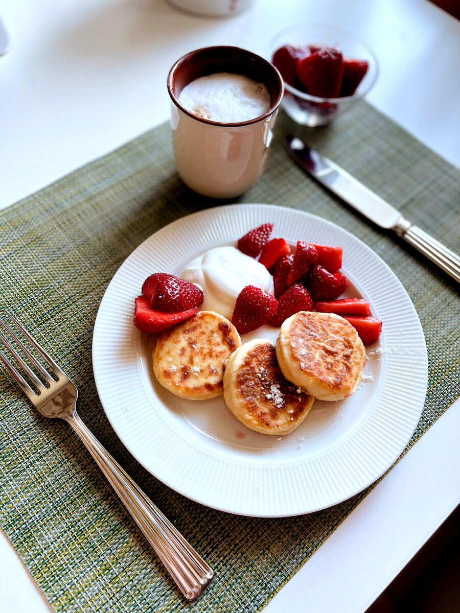Доброе утро! Продолжаю делиться идеями домашних завтраков и сегодня предлагаю начать день с моего самого любимого завтрака - сырников! Очень вкусное, очень красивое и, что важно, быстрое в приготовлении блюдо. Нам понадобится: 300г творога 5% жирности 1 яйцо 1 пакетик (8г) ванильного сахара 2 столовые ложки муки Хорошо разминаем творог, добавляем яйцо и остальные ингредиенты. На поверхность стола высыпаем еще 1-2 столовые ложки муки, выкладываем получившуюся массу и формируем сырники. Как следует разогреваем сковороду на сильном огне, добавляем растительное масло, выкладываем сырники и уменьшаем огонь. Обжариваем с каждой стороны до золотистой корочки, оставляем на самом слабом огне томиться еще минут 7-10. К сырникам можно добавить сметану, взбитые сливки, сезонные ягоды или фрукты, варенье. Приятного аппетита и отличного дня!