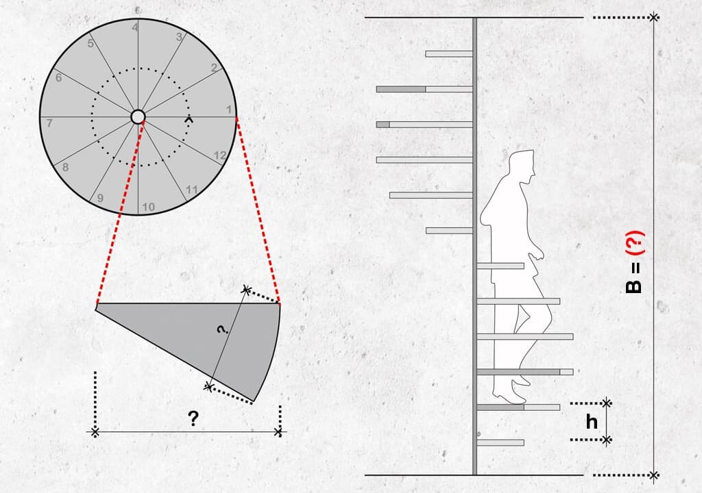 Винтовые лестницы экономят ценные квадратные метры, поскольку занимают гораздо меньшую площадь, чем обычная лестница. Существует много вариаций таких лестниц: спиральные, на витой или косой стойке. И все же самые распространенные имеют круглый формат с центральной прямой вертикальной стойкой, на которой крепятся ступени. Именно такой вариант будет рассматриваться в данной статье. Необходимые параметры Для расчета конструкции винтовой лестницы на вертикальной стойке необходимо знать три основных параметра: В – Высота подъема лестницы (расстояние между полом первого этажа и выходом на площадку второго этажа)