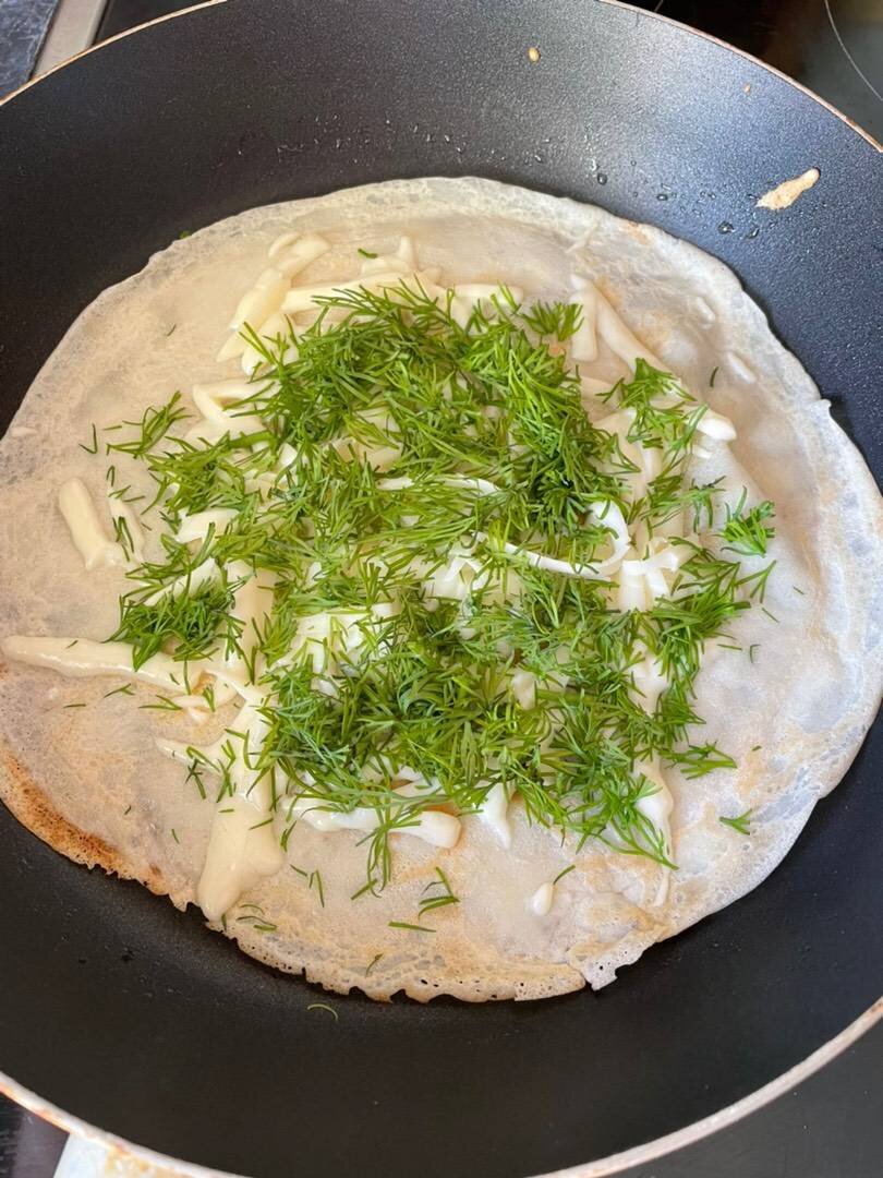 Ингредиенты: муки, молока, воды, яйцо, соли, сахара, подсолнечного масла, Моцарелла, Укроп Способ приготовления: Для блинов всыпаем в миску муку, добавляем соль, сахар и перемешиваем. Добавляем яйцо и стакан воды или молока. Перемешиваем, чтоб не было комочков. Вливаем остальную жидкость и подсолнечное масло. Если есть комочки, пробиваем тесто блендером. Жарим тонкие блинчики с одной стороны. Переворачиваем и выкладываем натертую моцарелу и нарезанный укроп. Готовим ещё 1-2 минуты и сворачиваем блинчик. Приятного аппетита!