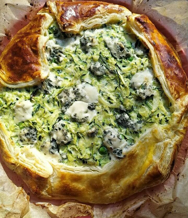 Быстро, просто и очень вкусно! А главное зелено, как лето! #несладкаявыпечка #традиции #Вильнюс Ингредиенты: небольших зелёных цукини, белая сладкая луковица, чеснока, зелёного лука, яйца, ферментного сыра, сыра с синей плесенью, соль, перец, молотый пажитник, слоёного теста, панировочных сухарей, желток + 2 ложки молока Способ приготовления: Приготовим начинку. Лук нарезать и обжарить на смеси сливочного и растительного масла. Цукини натереть на свекольной тёрке и отправить к луку. Добавить измельчённый чеснок и специи. Дать немного испарится лишней влаге от цукини. Обжаренную начинку немного остудить. Натереть ферментный сыр и вмешать в овощи. Вбить яйца. Нарезать зелёный лук и все тщательно перемешать. Форму выстелить бумагой, смазать маслом и выложить пласт теста. На дно будущего пирога высыпать панировочные сухари. Поверх сухарей выложить начинку. Загнуть края теста и смазать их желтком смешанным с молоком. Отправить в духовку на 20 минут, температура 200 гр.