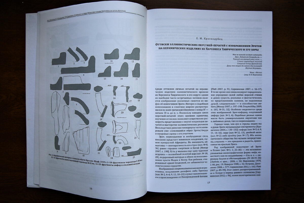 Краснодубец Е. М. Оттиски эллинистических перстней-печатей с изображением Эротов на керамических изделиях из Херсонеса Таврического и его хоры // Херсонесский сборник. 2020. Вып. 21. С. 17–28.