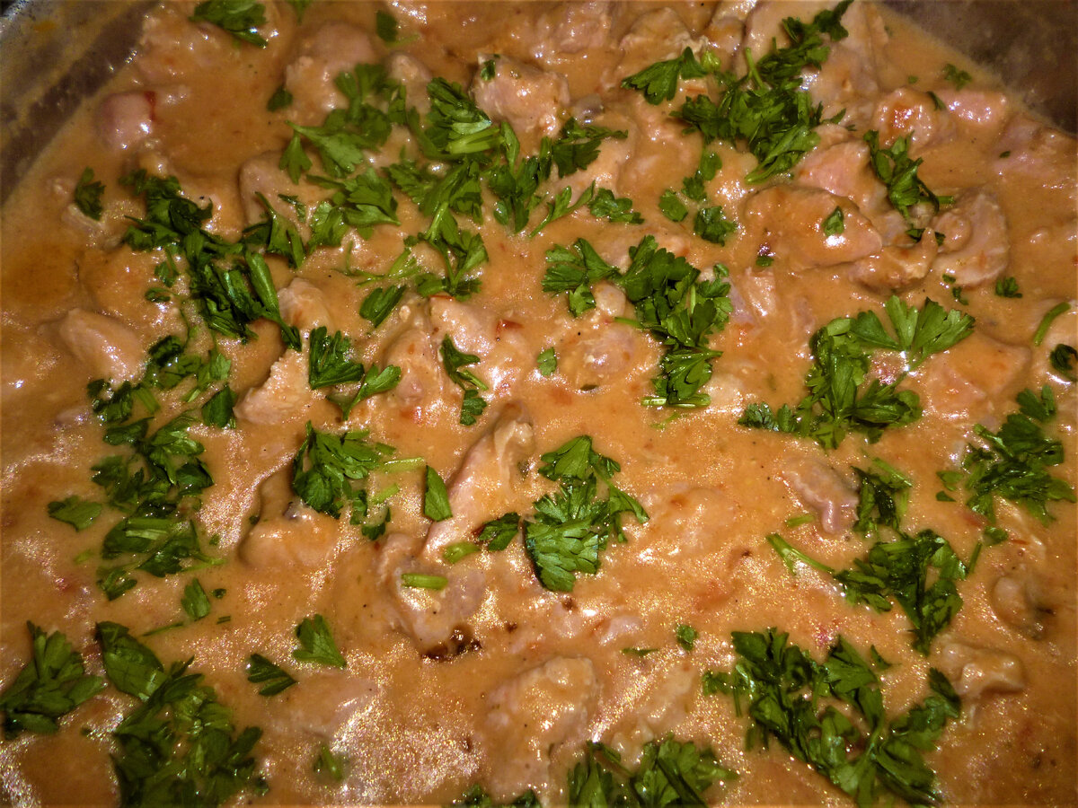 Этот способ приготовления гуляша смело можно отнести к самым простым и быстрым. Когда имеется хорошее мясо, но не имеется времени или сил на приготовление сложных блюд. Такой гуляш - для меня оптимальное решение. Быстро, много, сытно и очень вкусно. Этим способом можно готовить любое мясо, различается лишь время тушения. Нам потребуется: Филе индейки (курицы, свинины, телятины) 700-800г Луковица крупная 1 шт Томатный соус 3 ст.л. Сметана 0,5 стакана (100г) Мука 1 ст. л. (с горкой) Соль, перец Специи по вкусу. Мне больше всего в этом гуляше нравится молотый кориандр и паприка (1 ч. л.) Масло растительное 2-3 ст. л. Вода 1-1.5 стакана Томатный соус хорошо брать домашнего производства, с кусочками перца, чеснока или с зеленью. Однако, за неимением, вполне можно заменить на кетчуп хорошего качества или даже на томатную пасту. Количество томатной пасты следует сократить до 1-2 ст. л. и добавить щепотку сахара при приготовлении соуса. Это нейтрализует излишнюю кислотность. При