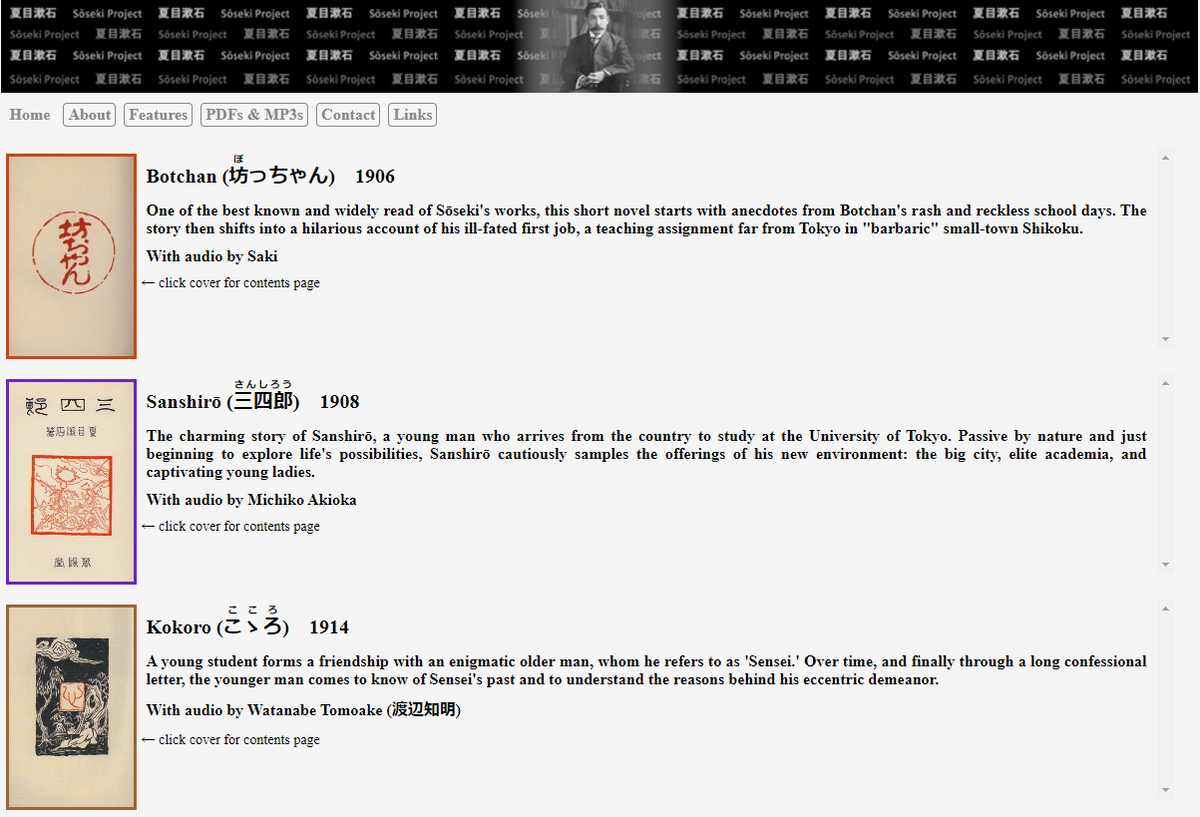 Проект Sōseki делает чтение произведений японского писателя Сосэки Нацумэ более доступным для изучающих японский язык.