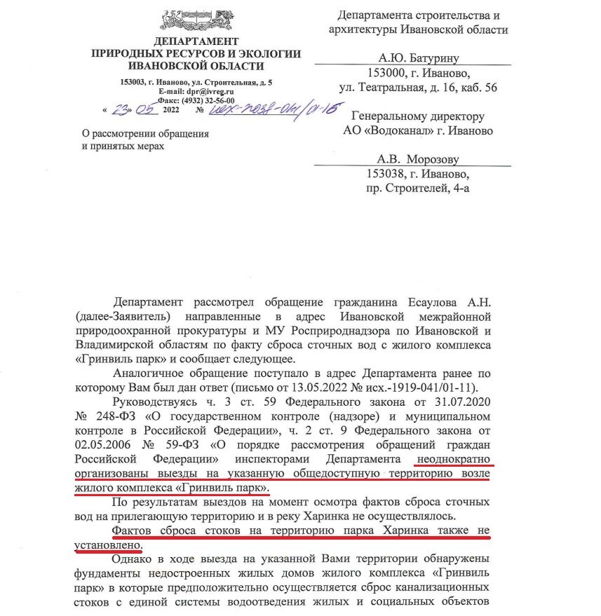 Пришёл ответ долгожданный от нашего департамента. Инспекторы, как блудливая выпускница после выпускного, путаются в местах проведения своих выездов регулярных. То ли в Гринвилль парке были, то ли в парке Харинка, но следов сброса канализационных вод не обнаружили.