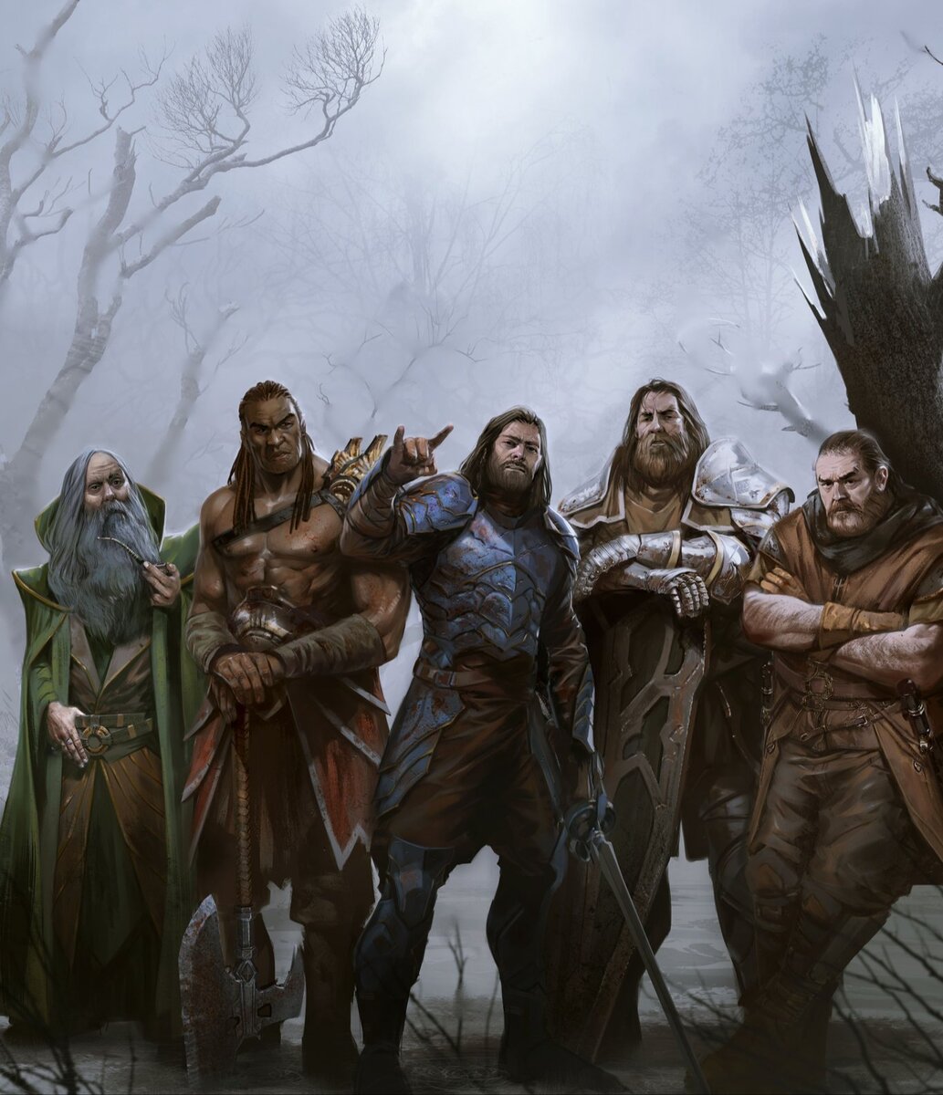 На картинке у нас соответственно изображена Сага, конечно не так комично, как ее описывал автор, хотя к концу произведения мужики уже набрали форму и скорее всего так и выглядели. С лева на права: Матрик, Гэбриель, Клей, Ганелон и Муг.