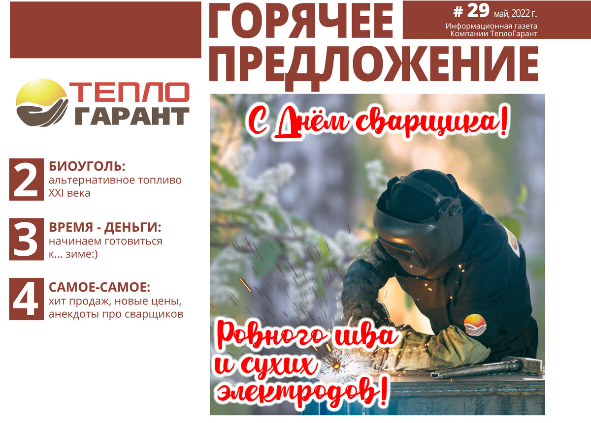 В День сварщика, 27 мая, вышел новый выпуск газеты «Горячее предложение». Читайте в номере газеты: 1) Биоуголь как современное альтернативное топливо