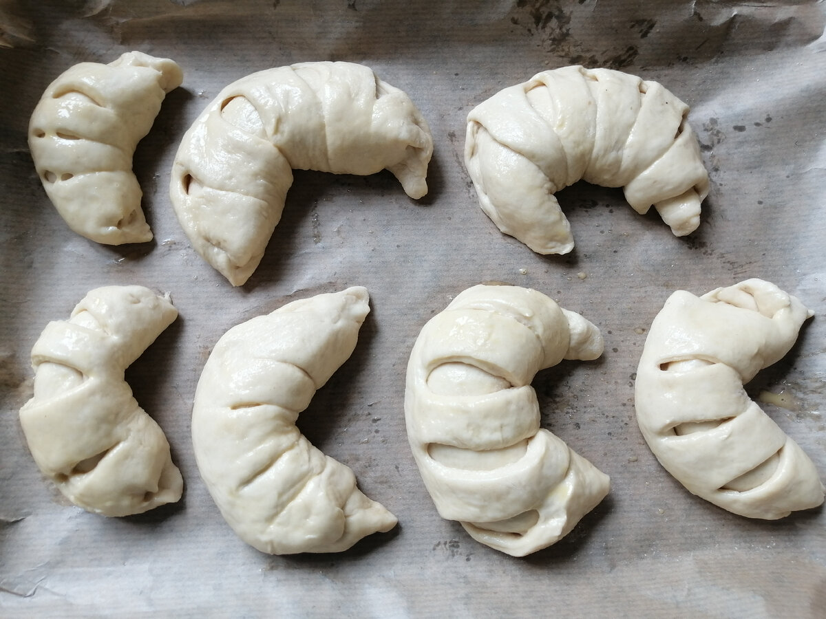 Всем привет 👋 мои дорогие читатели 😊 Рецепт: Начинка: Приготовление: Сначало сделаем опару. Возьмите глубокую ёмкость, высопите дрожжи, 1 ч.л. сахара, 2 ч.л. муки и влейте воду. Накройте полотенцем и оставьте на 30 минут. Когда опара готово влейте туда взбитые яйца и перемешайте. Далее просейте мука 2 раза, и постепенно вводите в смесь. Полученное тесто оставьте на 60 минут, обязательно накройте полотенцем. Потом поместите его и снова накройте полотенцем. Далее высопите на стол немного муки, это чтоб оно не прилипало. Всё тесто скрутите в колбасу, и нарежьте на равные части и сформируйте шарики. Далее оставьте их отдыхать минут на 15. Потом возьмите шарик и раскатайте в доль, положите начинку из корицы и сахара, или свою по желанию. Далее скрутите в колбасу, оставляя часть тесто, его нарежь вертикально и оберните рогалики, когда вы это сделайте, придайте ему форму. Так повторять пока тесто не закончится. Далее возьмите желток и положите туда 3 чайные ложки воды, и смажьте рогалики