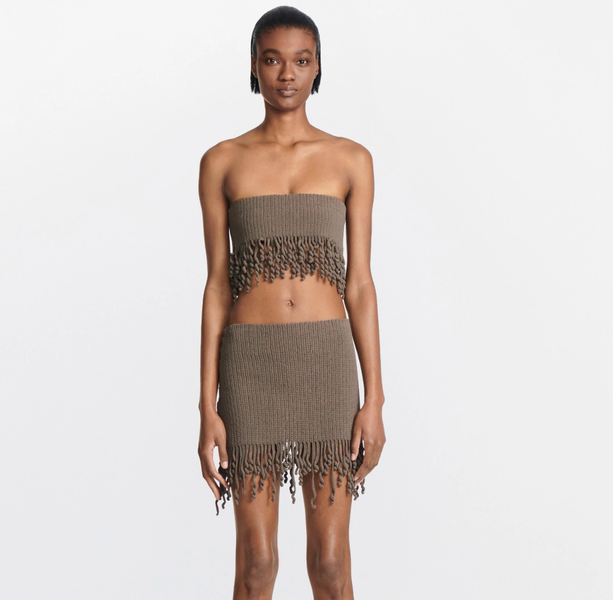 Юбка мини-длины из мягкого кордового трикотажа для плотного прилегания. У нее есть связанные вручную спиральные шнуры по краю и открытая молния сзади.