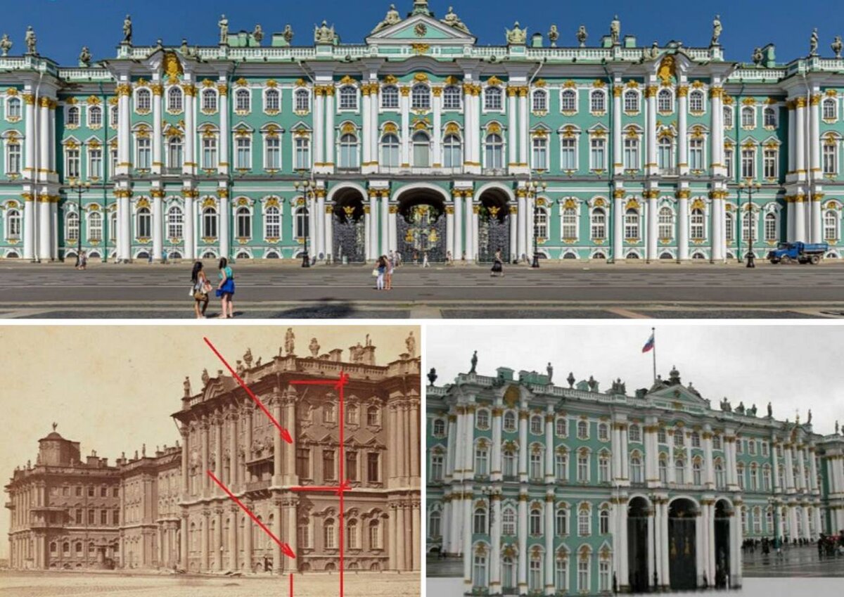На фото изображён Эрмитаж. Стоит обратить внимание, что первый этаж по какой-то причине существенно ниже, нежели второй, да и выглядит более приземленно. Если присмотреться, окна, которые должны быть расположены в теории над землёй, почему-то полностью практически погружаются под землю. Большинство залов Зимнего дворца располагаются по уровню ниже земли. Интересно, кому понадобилось строить помещения, погруженные под землю, да ещё и на территории, склонной к образованию болот? К тому же полуподвалы, что не секрет, возводить существенно дороже, нежели первый этаж. Гораздо выгоднее положить фундамент и сделать на нем первый этаж, нежели создавать второсортное здание и делать гидроизоляцию. А на третьем фото вид, как должен выглядеть Эрмитаж.