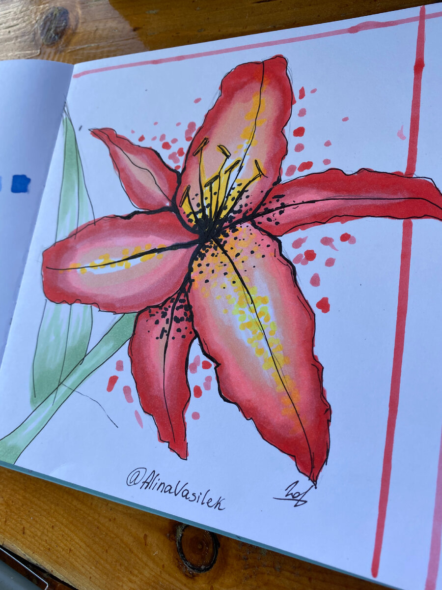 Привет! Мне очень нравятся цветы лилии и сегодня я хотела бы их нарисовать. Поэтому вот такой цветочек я буду рисовать в этой статье: Для начала я покажу то, что тебе понадобиться: Начнём! Сначала нарисуй круг и в середине поставь точку - это будет середина нашей лилии. Теперь проведи из точки 3 линии примерно нарзанном расстоянии - здесь будут 3 больших лепестка Нарисуй лепестки вокруг этих линий (Если честно, то пока эта картина напоминает мне не лилию, а вентилятор :) Теперь нарисуй три узких лепестка между большими Сотри круг посередине А затем нарисуй пыльцу, стебель и лист Прорисуем наш цветок более детально и обведём чёрной ручкой или линером (но это необязательно) Теперь начнём раскрашивать, какие цвета маркеров я использовала: + чёрный (120) для обводки и некоторых деталей. Также ты можешь использовать прозрачный маркер блендер (0) для градиентов Сначала мы будем красить розовыми цветами большие лепестки. Делаем растяжку (переход цветов/градиент) от 16 до 135, от темного до с