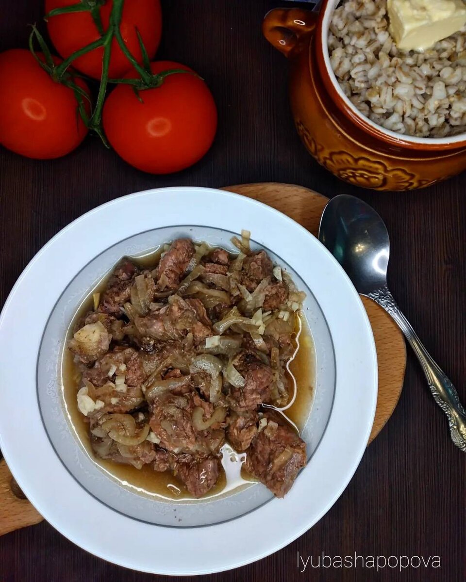 #традиции #Волгоград #говядинапокремлёвски 🥩 Говядина по-кремлёвски - это ароматное, нежное и сочное мясо, которое 1,5 часа томится в луковом соусе. 💡 В оригинале берётся от 100 до 200 граммов сливочного масла, я уменьшила его количество, т.к. на мой взгляд, блюдо так получается менее жирным. Ингредиенты: мякоти говядины, репчатого лука, воды, сливочного масла, соли, сахара, уксуса 9%, лавровых листа, горошка чёрного перца, чеснока Способ приготовления: Чистую говядину нарезать на крупные куски и уложить на дно кастрюли с толстым дном или небольшой сковороды. Вторым слоем выложить полукольца лука. Повторить слои пока не закончится мясо и лук. Сливочное масло нарезать кусочками и выложить на лук. Влить воду и поставить на плиту. Накрыть крышкой и тушить на минимальном огне 1 час. Добавить уксус, соль, сахар, горошки перца, лавровые листы и тушить ещё 30 минут. Перемешивать мясо не нужно! За 5 минут до готовности добавить измельчённый чеснок, досолить и снять с огня. На гарнир к тушёно