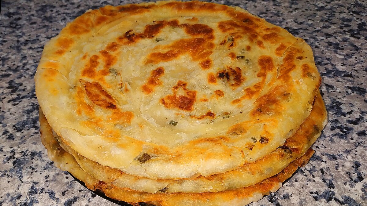 Узбекская катлама - это жареная слоеная лепешка из пресного теста, с начинкой или без нее. Существуют несколько способов приготовления катламы. Предлагаю самый простой. Ингредиенты на 4 шт.: Тесто: мука пшеничная - 500 гр. соль - 1 ч.л. вода - 280 мл. масло растительное - 20 мл. Начинка: лук репчатый - 3 шт. зеленый лук - 70 гр. соль и черный перец по вкусу сливочное масло растопленное - 70 мл. масло растительное для жарки 1. Замесить тесто, разделить на 4 части и убрать на 30 минут. 2. Лук нарезать полукольцами, добавить нарезанный зеленый лук, посолить и поперчить по вкусу. Все немного примять, жидкость слить. 3. Раскатать тесто в тонкий пласт, смазать сливочным маслом. Сверху выложить немного начинки. Свернуть плотно в рулет, затем в улитку. Убрать в холодильник на несколько минут, пока вы готовите остальные лепешки. 4. Руками придать форму лепешки толщиной 1 см. 5. Обжарить в небольшом количестве масла с двух сторон на маленьком огне под закрытой крышкой. Под