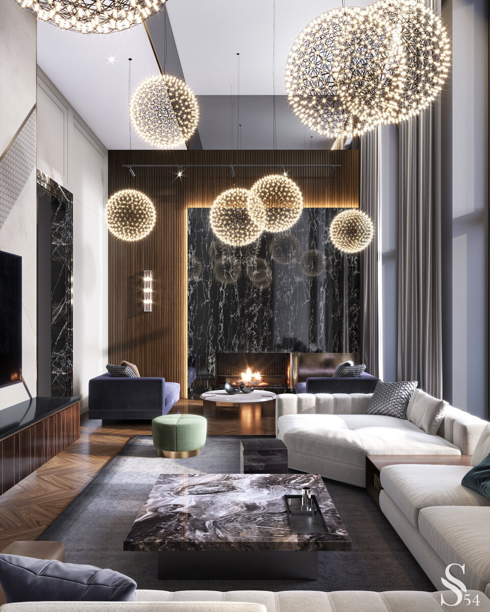Новый проект Studia 54 в Москве – интерьер двухуровневых апартаментов в самых трендовых оттенках 2022, холодном сером и фиолетовом.